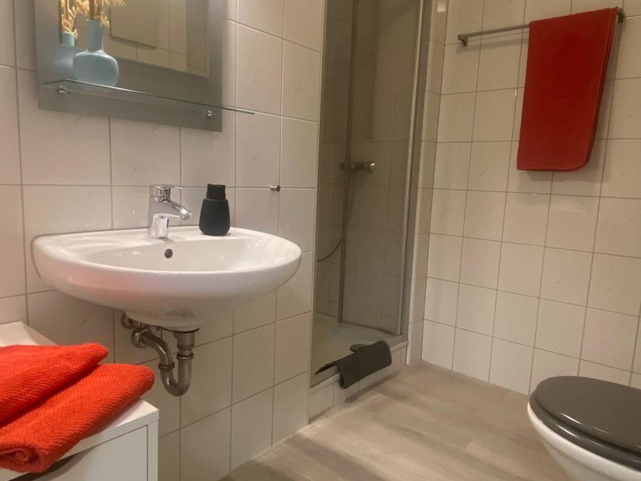 Dusche im Bad, Fliesenboden im Bad, Handtücher, Spiegel, Föhn, Wlan kostenfrei.