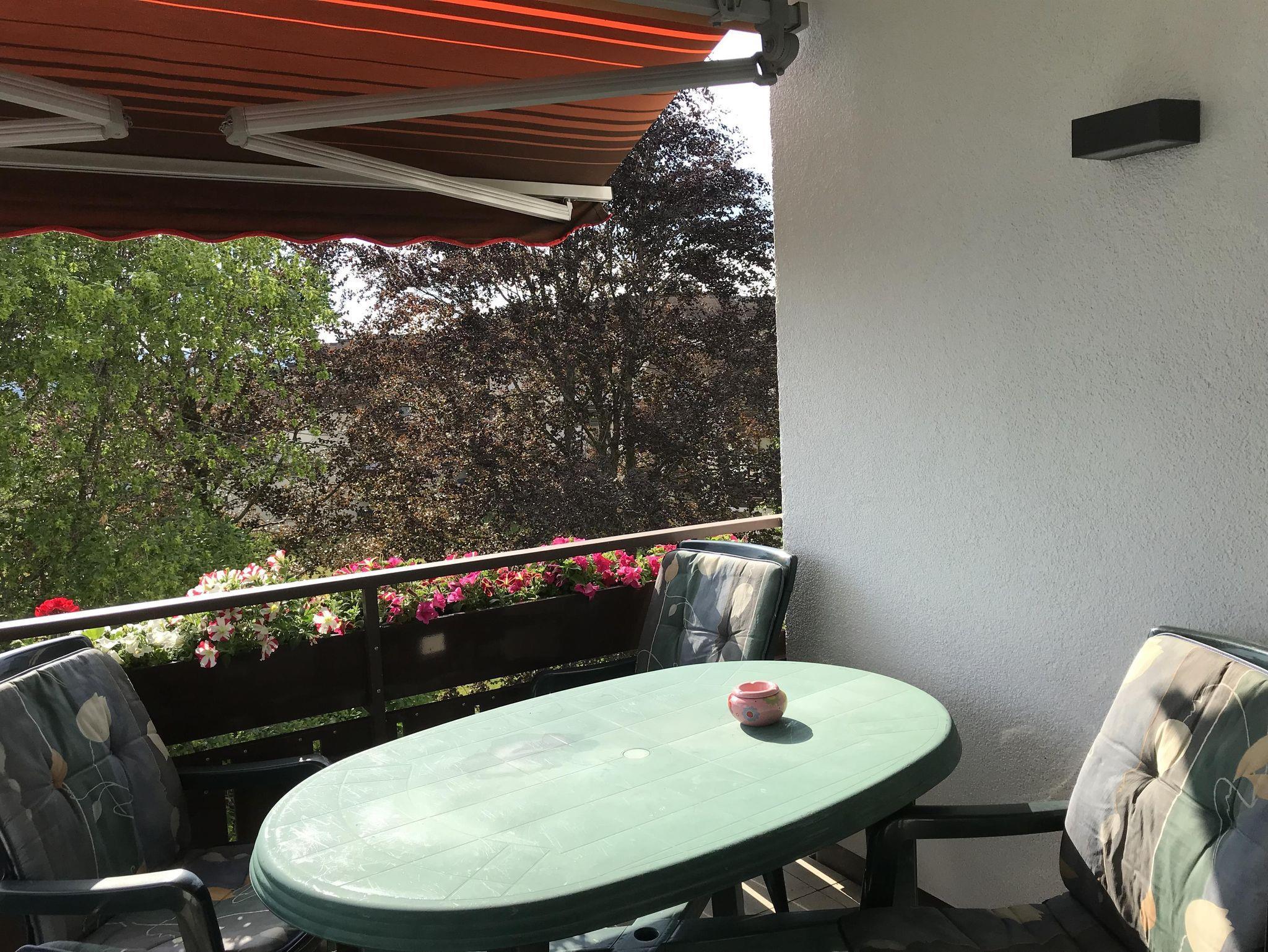 Vom Wohnzimmer aus gehen Sie auf den Balkon, wo eine Sonnenmarkise Schatten spendet und ein Tisch mit vier Stühlen zum gemütlichen Tagesausklang einladen.