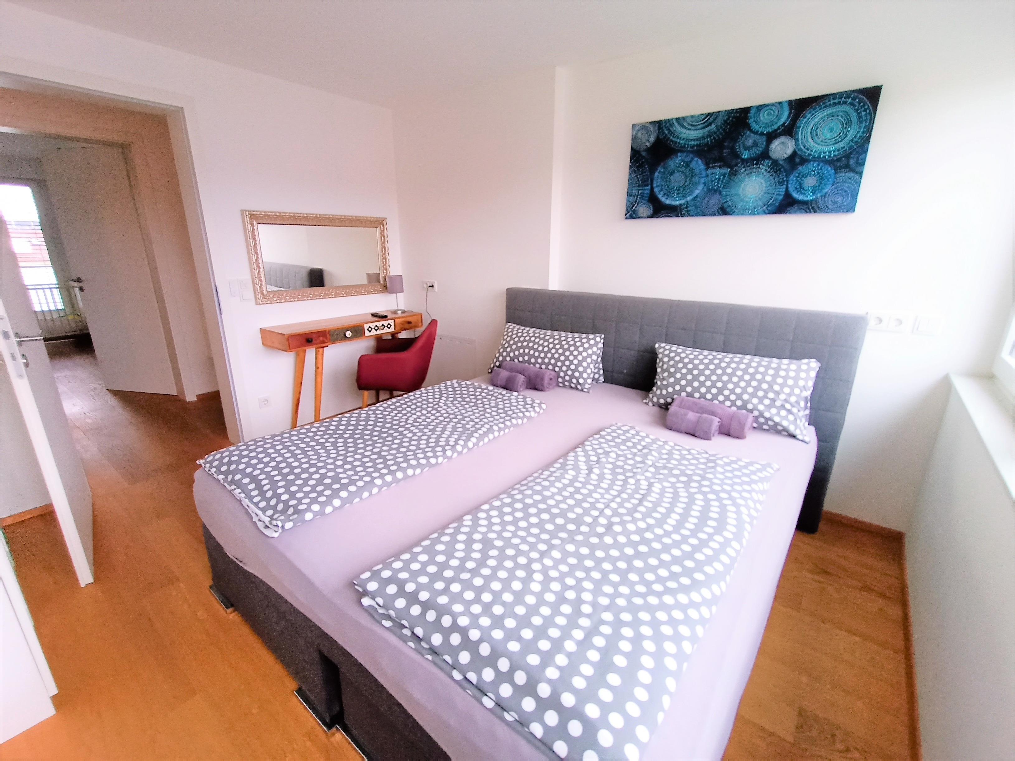 Die Ferienwohnung XL 119 verfügt über drei Schlafzimmer mit jeweils Doppelbett - zwei davon sind mit Kinderbett (Kind bis 2 Jahre) oder Zustellbett (Kind bis 12 Jahre) möglich, zwei Badezimmer - eines mit DU/Wanne/WC und ein Duschbad /WC mit Waschtrockenautomat-plus ein separates Gäste-WC. Der große Wohnraum mit topmodernem Küchenblock, großzügigem Essbereich und Wohnbereich (65-Zoll-TV) mit Balkon und ist absolut hochwertig ausgestattet. Von hier aus haben Sie einen Panoramablick über die Stadt Friedrichshafen sowie Bergsicht bei guter Witterung.