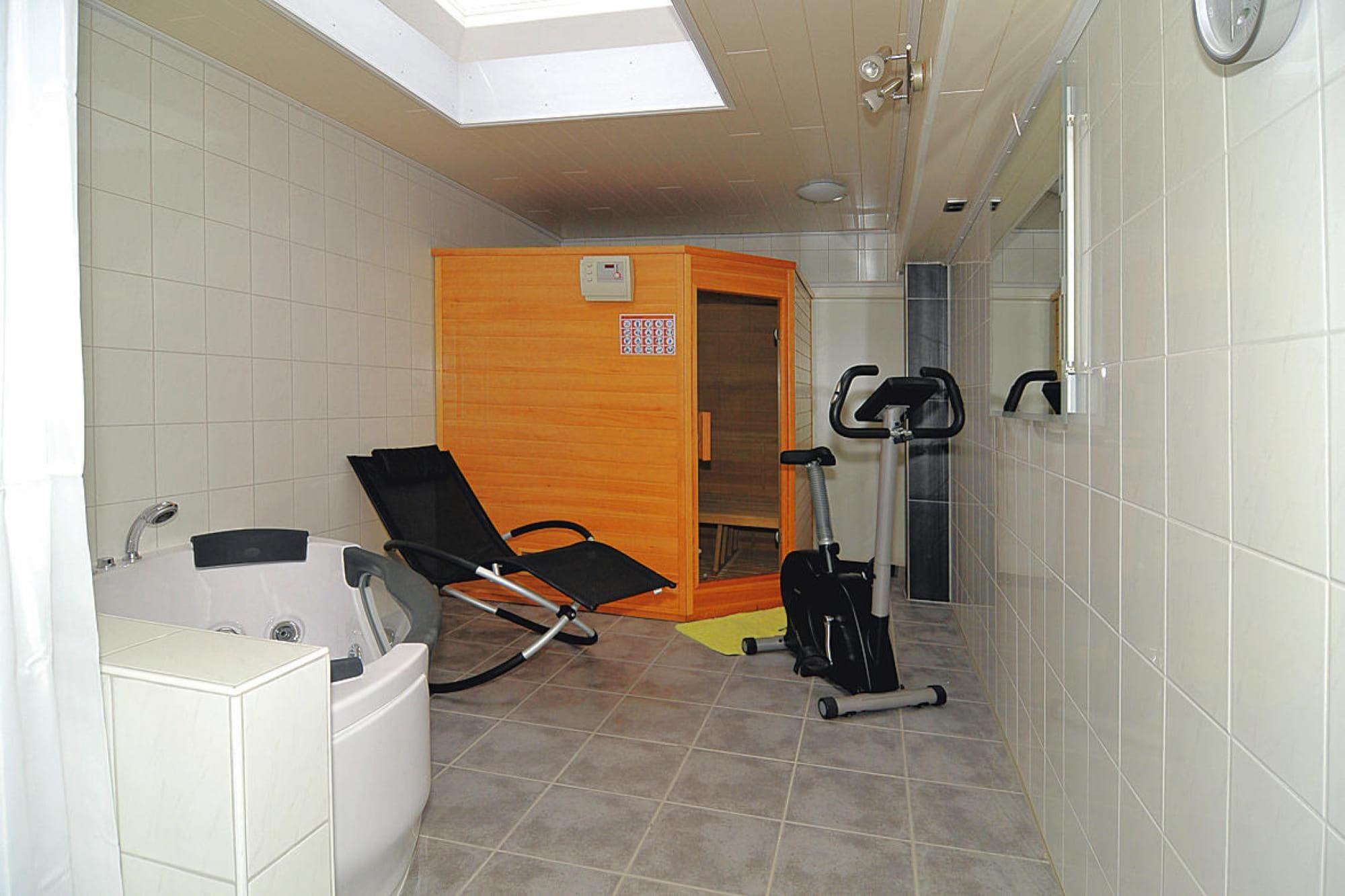 Parterre: (Küche(Kochplatte(4 Kochplatten, Ceranfeld, elektrisch), Wasserkocher, Dunstabzugshaube, Kaffeemaschine, Backofen, Mikrowelle, Spülmaschine, Kühlschrank(+ Gefrierfach)), Wohn/Esszimmer(TV(Satellit), Esstisch, Sitzecke), Toilette(Waschbecken, Toilette)) Dachgeschoss: (Schlafzimmer(Doppelbett), Schlafzimmer(2x Einzelbett), Badezimmer(Dusche, Waschbecken, Toilette, Föhn)) Nebengebäude: (Whirlwanne(Gemeinschaftliche Nutzung mit anderen Gästen, im Innenbereich, gegen Gebühr), Sauna(Gemeinschaftliche Nutzung mit anderen Gästen, gegen Gebühr)) Grill, Waschmaschine, Terrasse, Gartenmöbel, Parkplatz, Fahrräder verfügbar, Hochstuhl, Babybett (kostenlos), Wäschepaket inklusive