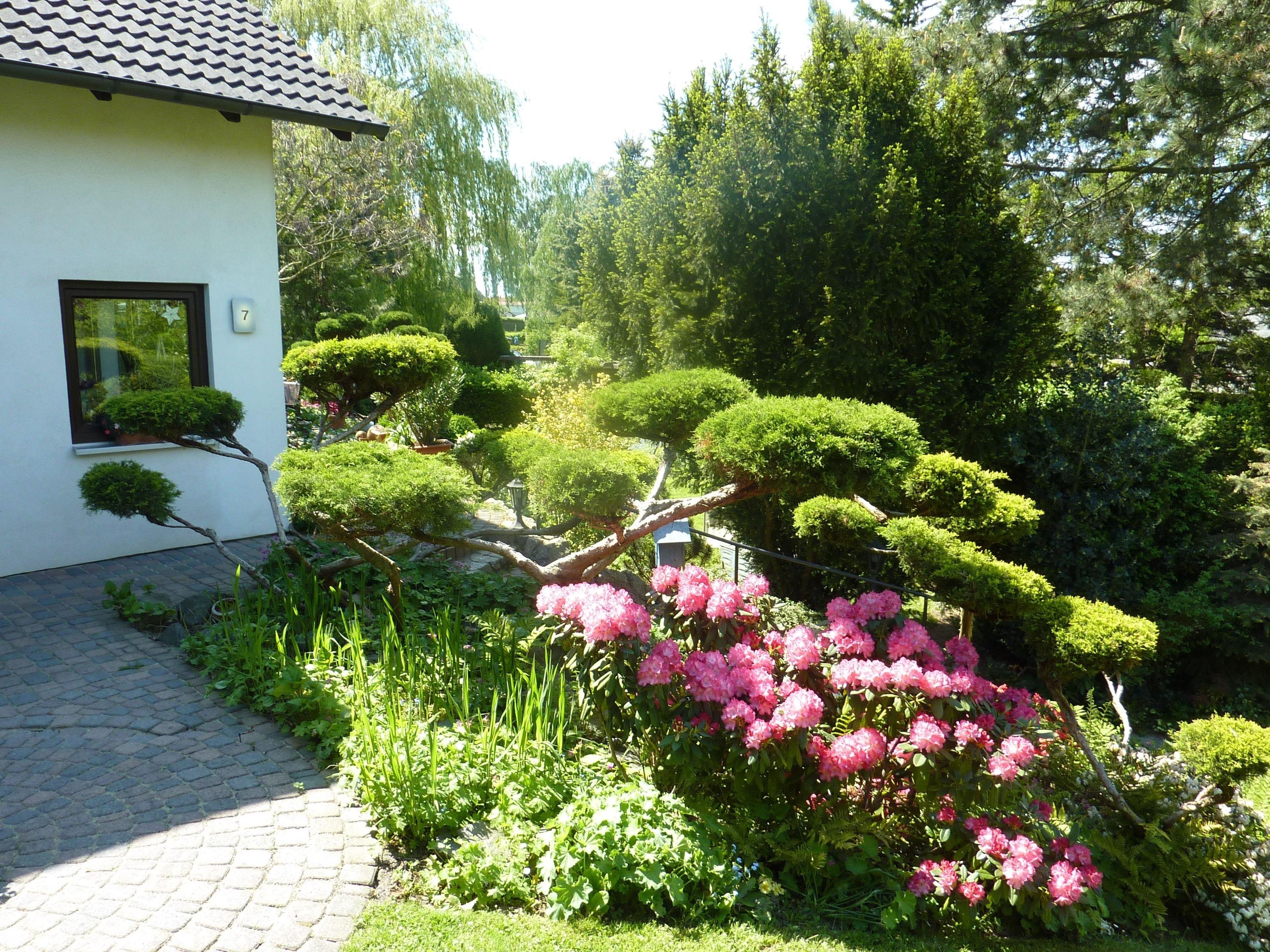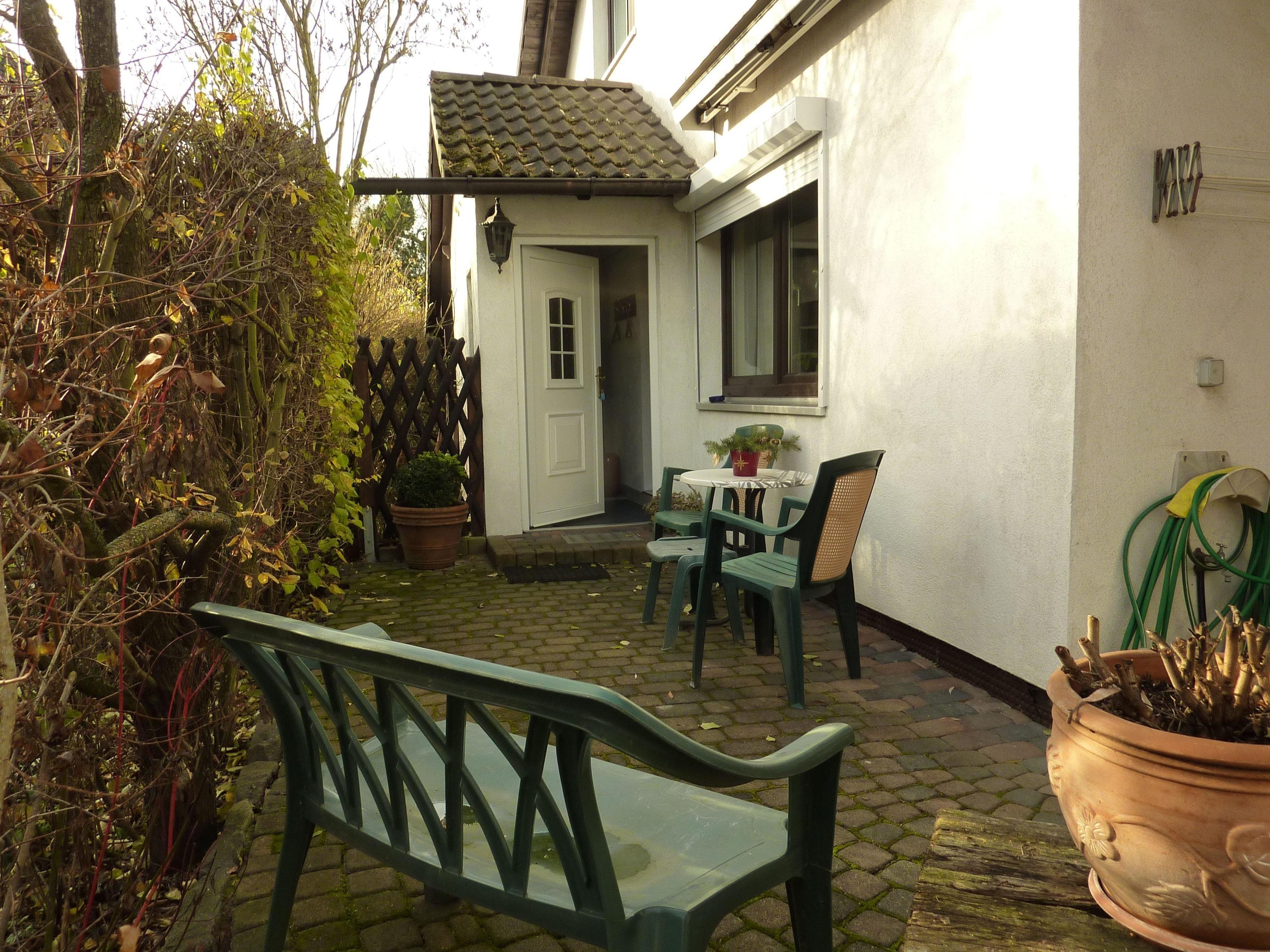 Kleine Terasse, möbliert. Parkplatz vor dem Haus.