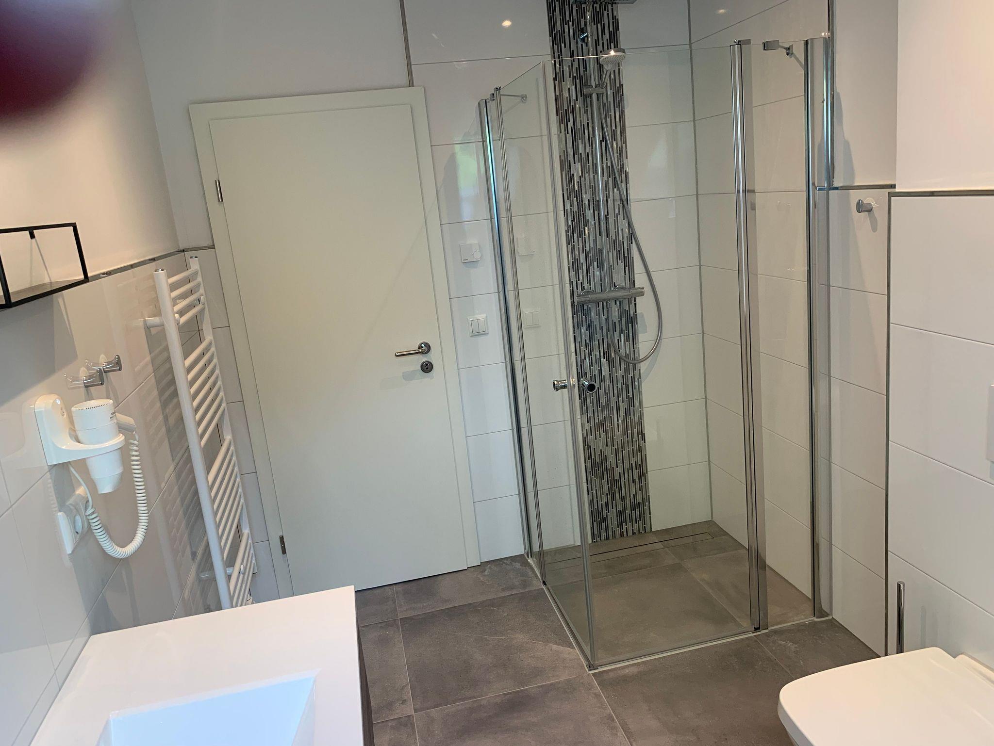 Die Bäder bieten moderne Waschtische und Raindanceduschen. Das große Bad verfügt zusätzlich über eine Sauna. Alle Räume werden über eine Fussbodenheizung beheizt..