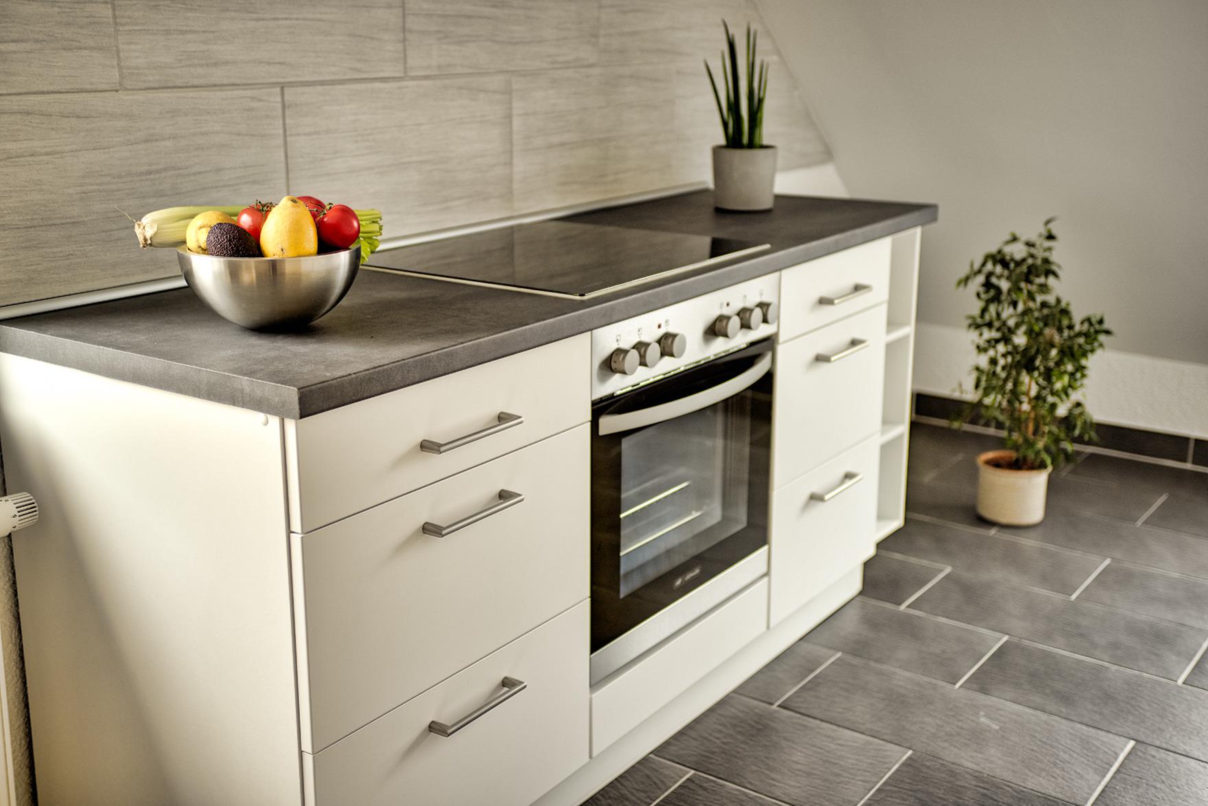 Komfortausstattung Kochen (Töpfe, Bratpfanne, Salz, Pfeffer und Öl)