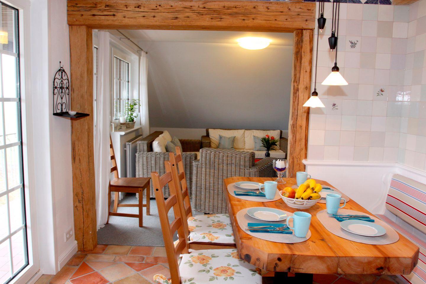 Die Ferienwohnung erstreckt sich über eine Etage im ersten Stock und bietet mit insgesamt 4 Zimmern eine komfortable und großzügige Aufteilung. Die drei Schlafzimmer sind geschmackvoll eingerichtet und garantieren eine erholsame Nachtruhe. Zusätzlich finden Sie im Wohnzimmer ein komfortables Sofa sowie einen Essbereich, der ideal für gesellige Abende ist.