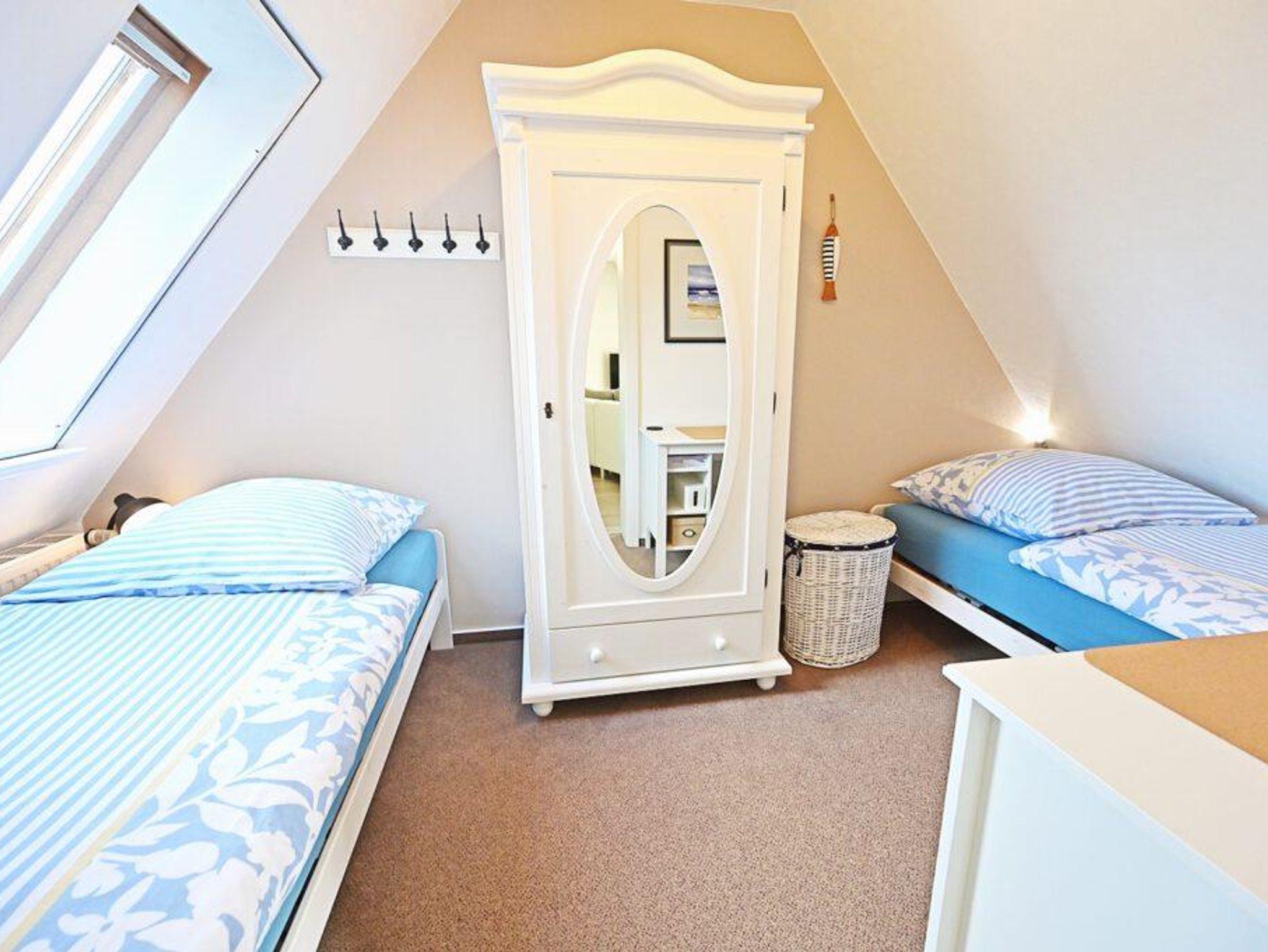 Ein Schlafzimmer mit 2 Einzelbetten (90 x 200 cm), Kleiderschrank mit Spiegel und kleinem Schreibtisch.