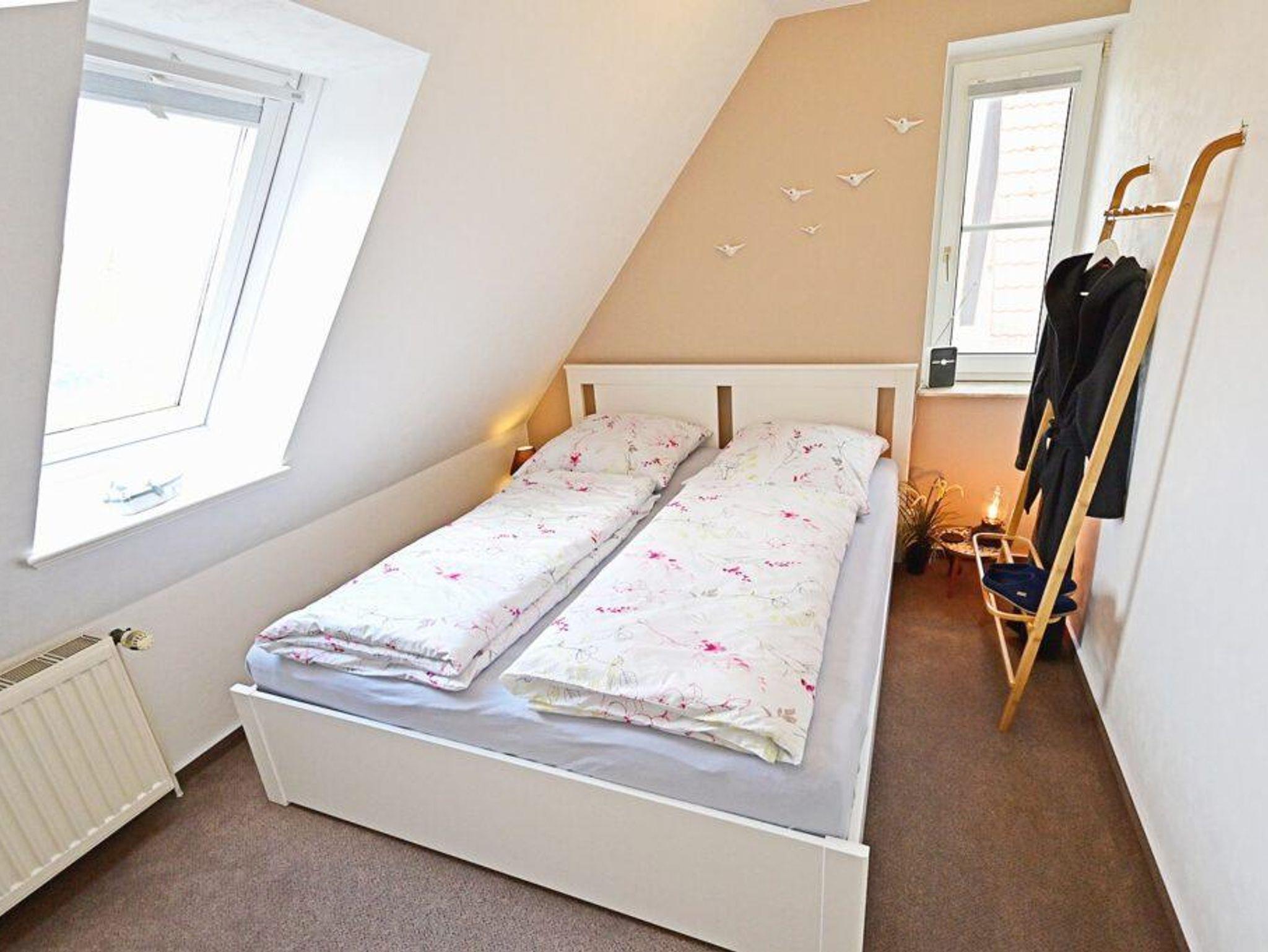 Ein Schlafzimmer mit Doppelbett (160 x 200 cm, 2 Einzelmatratzen), Kommode und Kleiderstange.