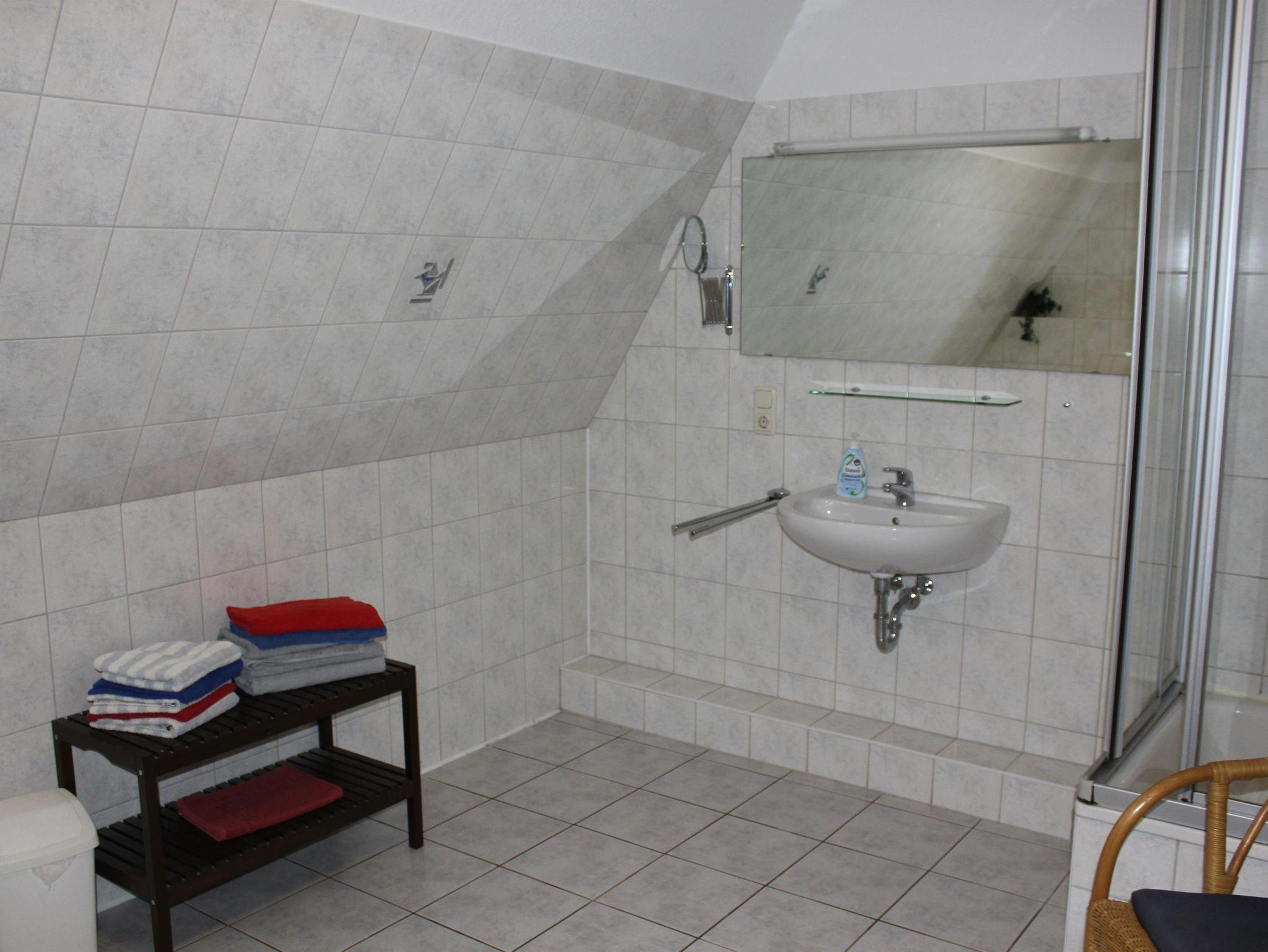 Über eine Holztreppe gelangt man in das Obergeschoss mit einem Schlafraum mit Doppelbett, ein Schlafraum mit 3 Einzelbetten und ein geräumiges Bad mit Dusche und WC.
