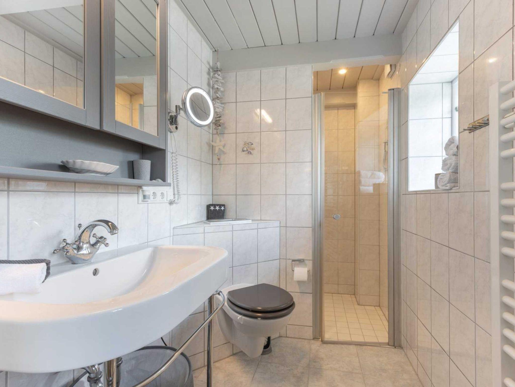 Badezimmer (Duschbad) mit bodengleicher Dusche, WC, Handtuchwärmer, Kosmetikspiegel, Föhn und Tageslicht.
