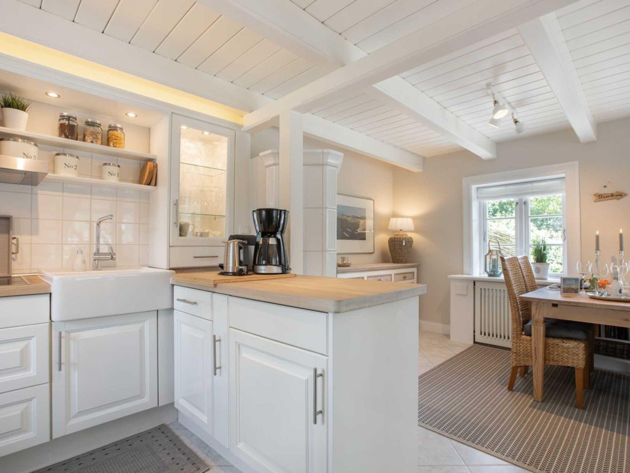 Wohnzimmer mit großem Ecksofa, Sessel, TV (Sat), Stereo-Kompaktanlage mit CD-Player und Haushaltsschrank mit Staubsauger. Essbereich mit Esstisch für bis zu 4 Personen und gekacheltem Kaminofen für besondere Behaglichkeit. Offene Küche mit Backofen, Geschirrspüle, Kühlschrank mit Gefrierfach und DeLonghi Nespresso Kapsel-Kaffeemaschine. Direkter Zugang zum schönen Rosen-Garten und der möblierten Süd-Terrasse mit Strandkorb.