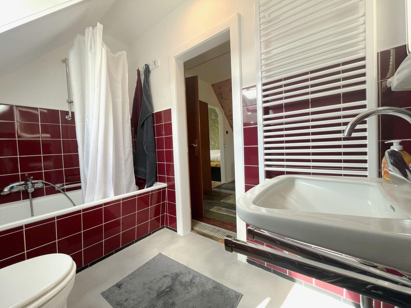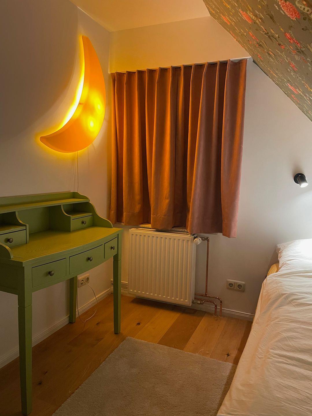 Das Melkmanns ist gut 130qm groß und bietet auf 2 Etagen entspannt Platz für 5 - 6 Gäste. In den 3 unterschiedlich großen Schlafzimmern kann man es sich jederzeit gemütlich machen, wobei im größten Schlafzimmer auch ein Tisch zum Arbeiten – wenn es denn unbedingt sein muss – oder zum Spielen bereitsteht. Das kleinste Schlafzimmer ist mit zwei Einzelbetten ausgestattet. Und sollte man sich zwischendurch mal aufs Ohr hauen wollen, steht im großen Flur auch ein Schlafsofa parat. Im Vollbad kann man nach einem Strandtag nochmal gemütlich in der Wanne abtauchen und im Duschbad unten schnell unter die Brause springen. Ab Herbst entsteht hier auch eine Sauna – stay tuned! Zusätzlich gibt’s auch noch ein praktisches Gäste-WC. Für die kleinen Gäste stehen zwei Reisebetten und zwei Hochstühle bereit.