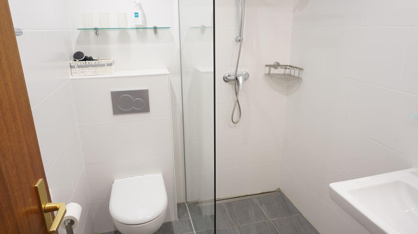 Das Badezimmer verfügt über eine bodengleiche Dusche, WC, Waschbecken, Spiegel und Haartrockner.