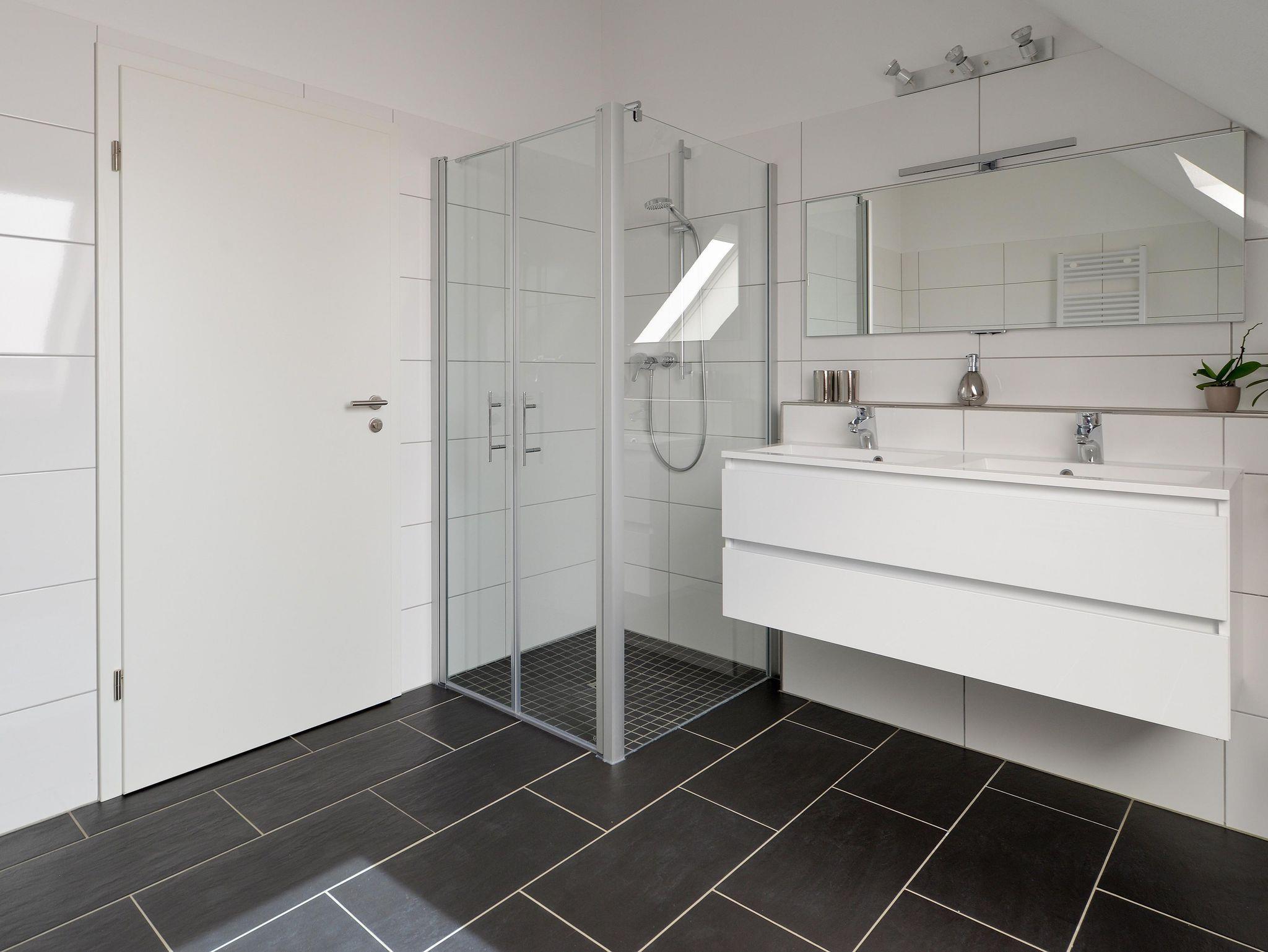 Das Badezimmer im ersten Stock befindet sich zwischen den beiden Schlafzimmern und ist sehr geräumig. In diesem Badezimmer befindet sich auch eine Toilette, sowie Doppelwaschbecken und eine Duschkabine. Es gibt auch eine schöne Infrarotsauna in diesem Badezimmer.