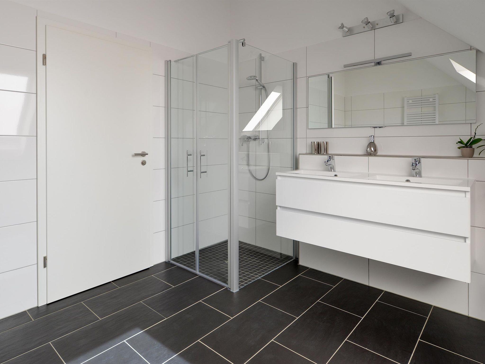 Das Badezimmer verfügt über eine Toilette, ein Doppelwaschbecken und eine geräumige Dusche. Die Schlafzimmer verfügen über ein geräumiges Doppelbett und einen großen Kleiderschrank mit Spiegel.