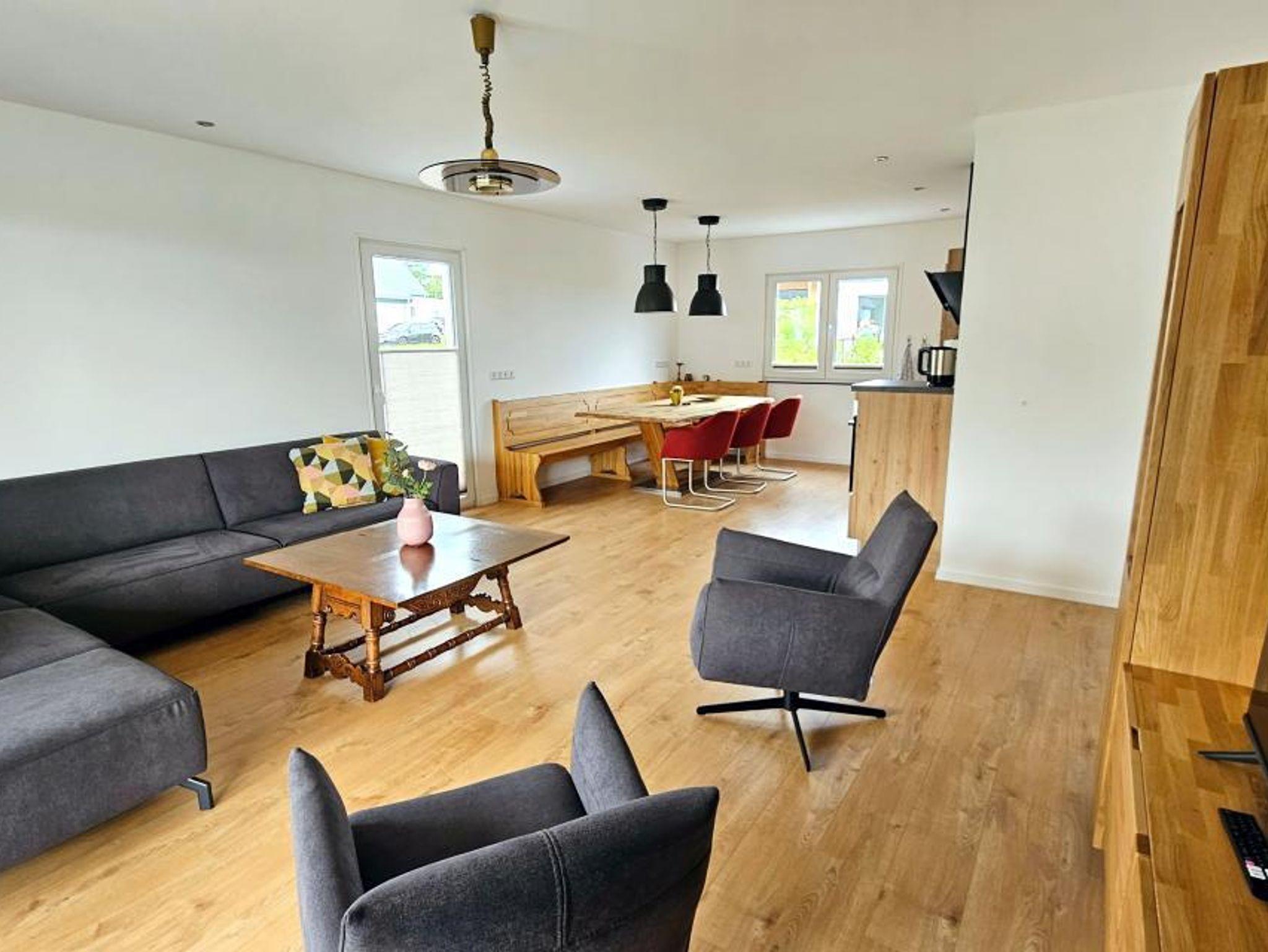 Das Wohnzimmer verfügt über eine Sitzecke mit einem geräumigen 2,5-Sitzer-Sofa, drei Sesseln, Flachbild-TV und einem geräumigen Esstisch für 4 Personen. Für eine perfekte Temperatur im Haus ist das gesamte Haus mit einer Fußbodenheizung ausgestattet. Der Essbereich verfügt über einen geräumigen Esstisch, an dem Sie eine köstliche Mahlzeit genießen können. Die Terrasse ist durch die Terrassentüren mit einem Sitzbereich unter dem Vordach zugänglich.