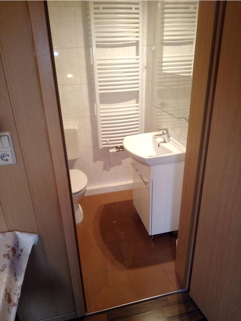 Von der Küche aus gehen Sie in das erste Schlafzimmer (Kranichnest) mit einem Doppelbett und einem Kleiderschrank, sowie einem Fernsehgerät. Zu diesem Schlafzimmer gehört ein eigenes Badezimmer mit einer Dusche, dem WC und einem Waschbecken.