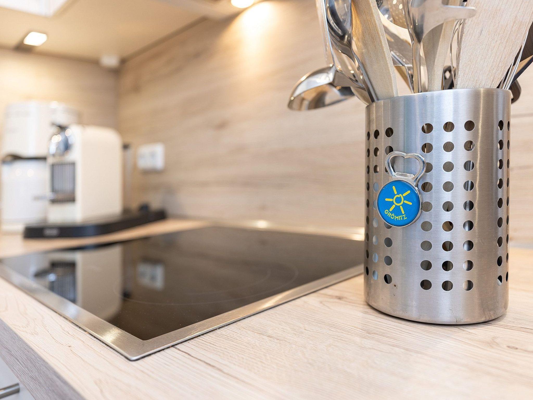 Moderne, komplett ausgestattete Küche mit Spülmaschine, 4 Platten Cerankochfeld, Kühlschrank mit kleinem 3-Sterne Gefrierfach, Toaster, kleinen Backofen, Wasserkocher und Kaffeemaschine.