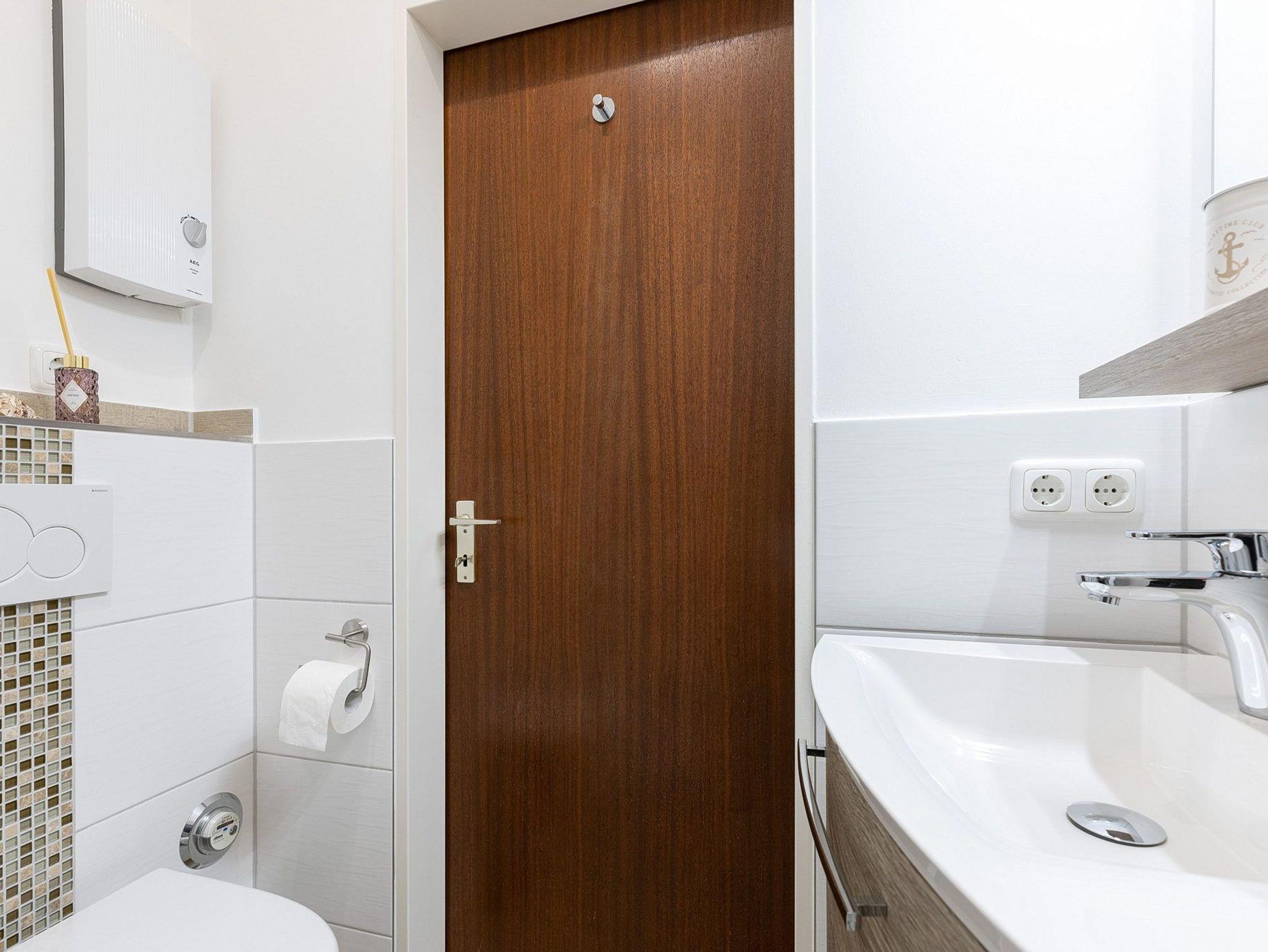 Hell gefliestes, gepflegtes Bad mit Dusche, WC und Waschbecken.
