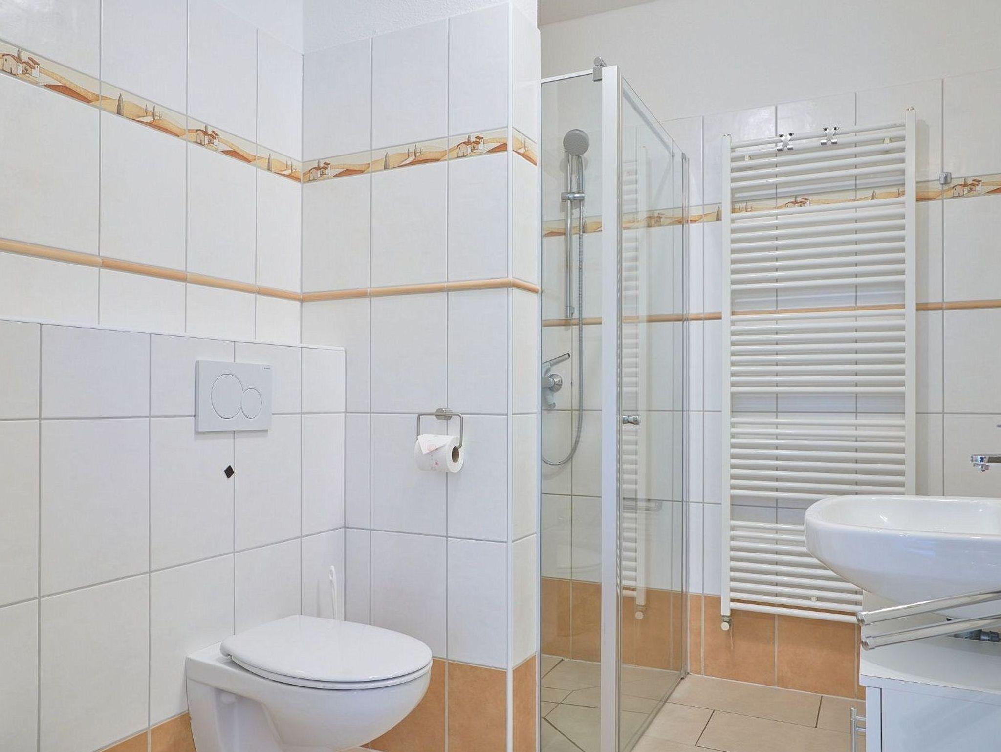 Modernes, hell gefliestes Tageslichtbad mit ebenerdiger Dusche, Urinal, WC und Waschbecken.