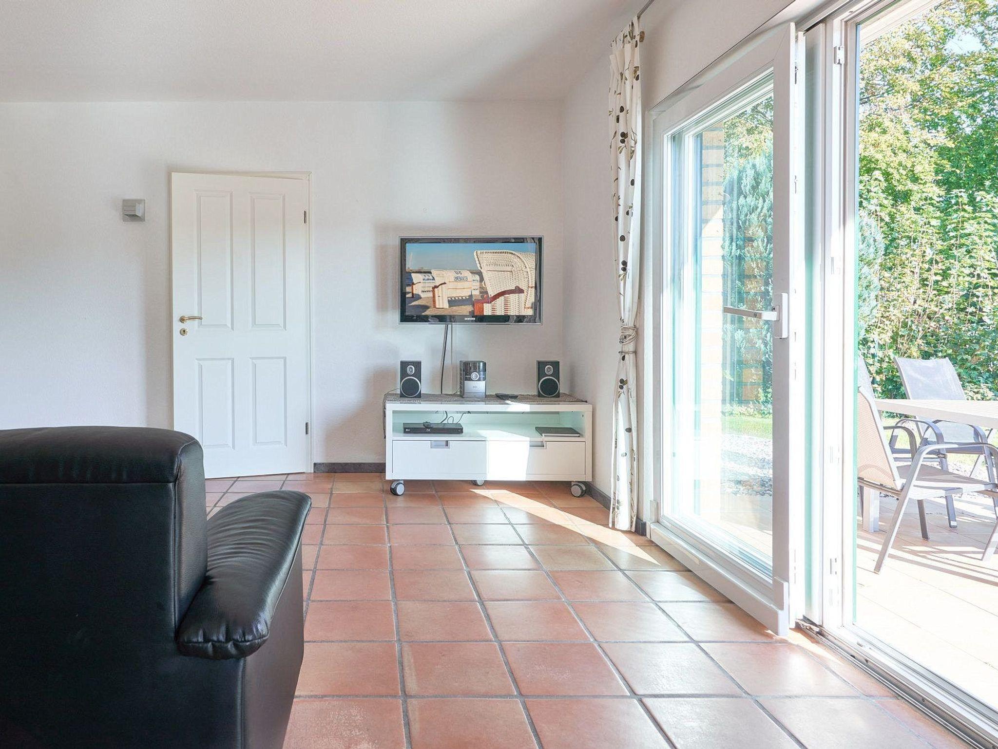 Helles, freundliches, modern eingerichtetes Wohn- und Esszimmer mit direktem Zugang zur Terrasse. Das Wohn- und Esszimmer ist mit einem Essplatz für 6 Personen, einer Leder-Eckcouch mit Schlaffunktion (115x195cm), einem Couchtisch, einer Kommode und Fußbodenheizung ausgestattet. Zur Unterhaltung steht ein Flachbildschirm, ein Blue Ray-Player und eine Mini-Stereoanlage mit CD-Player zur Verfügung.