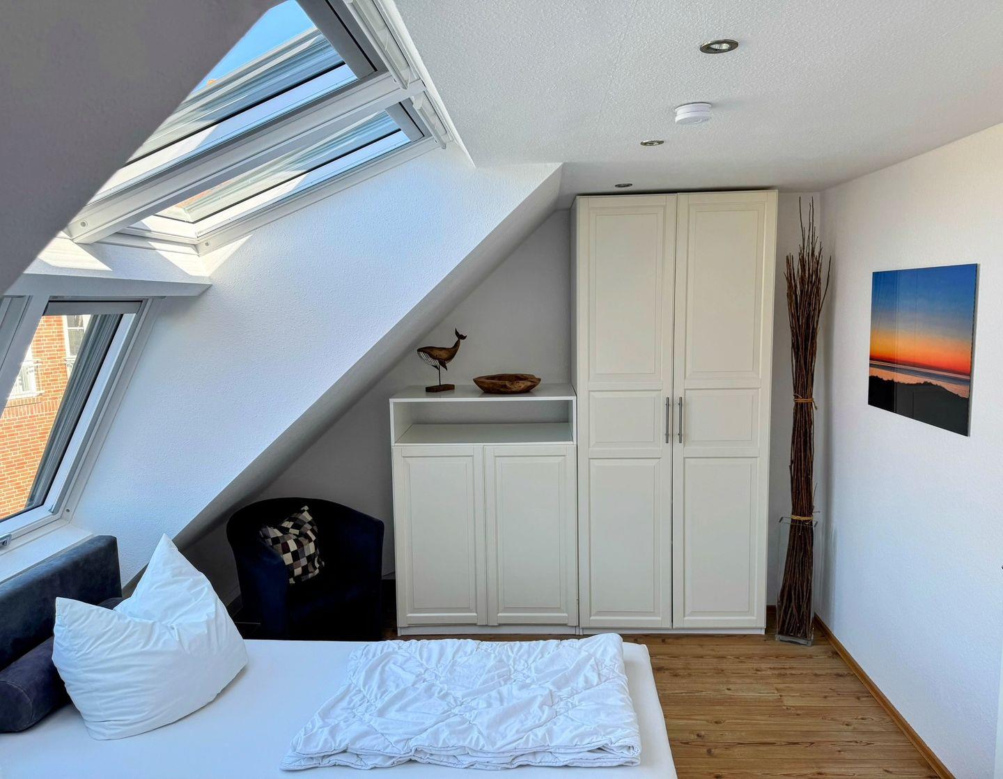 Das Ferienhaus (Nichtraucher!) verfügt über 3 Schlafzimmer (Doppelbett + 2 Einzelbetten (die jeweils zum Doppelbett ausgezogen werden können)) die sich im 1. Stock befinden. Im Jahr 2026 wurden beide Schlafzimmer im 1. OG mit neuen und deutlich größeren Veluxfenstern ausgestattet, die für eine tolle Lichtdurchflutung und einen schönen Wasserblick in dem Doppelbett-Zimmer sorgen. Das 3. Schlafzimmer befindet sich in der ausgebauten Galerie unterm Dach. In allen 3 Schlafzimmern gibt es einen Fernseher. Das große Veluxfenster in der Galerie ist mit einem Verdunklungsrollo ausgestattet. Auch die anderen beiden Schlafzimmer verfügen über Verdunklungsmöglichkeiten und hier ist mindestens 1 Fliegengitter pro Schlafzimmer vorhanden.
