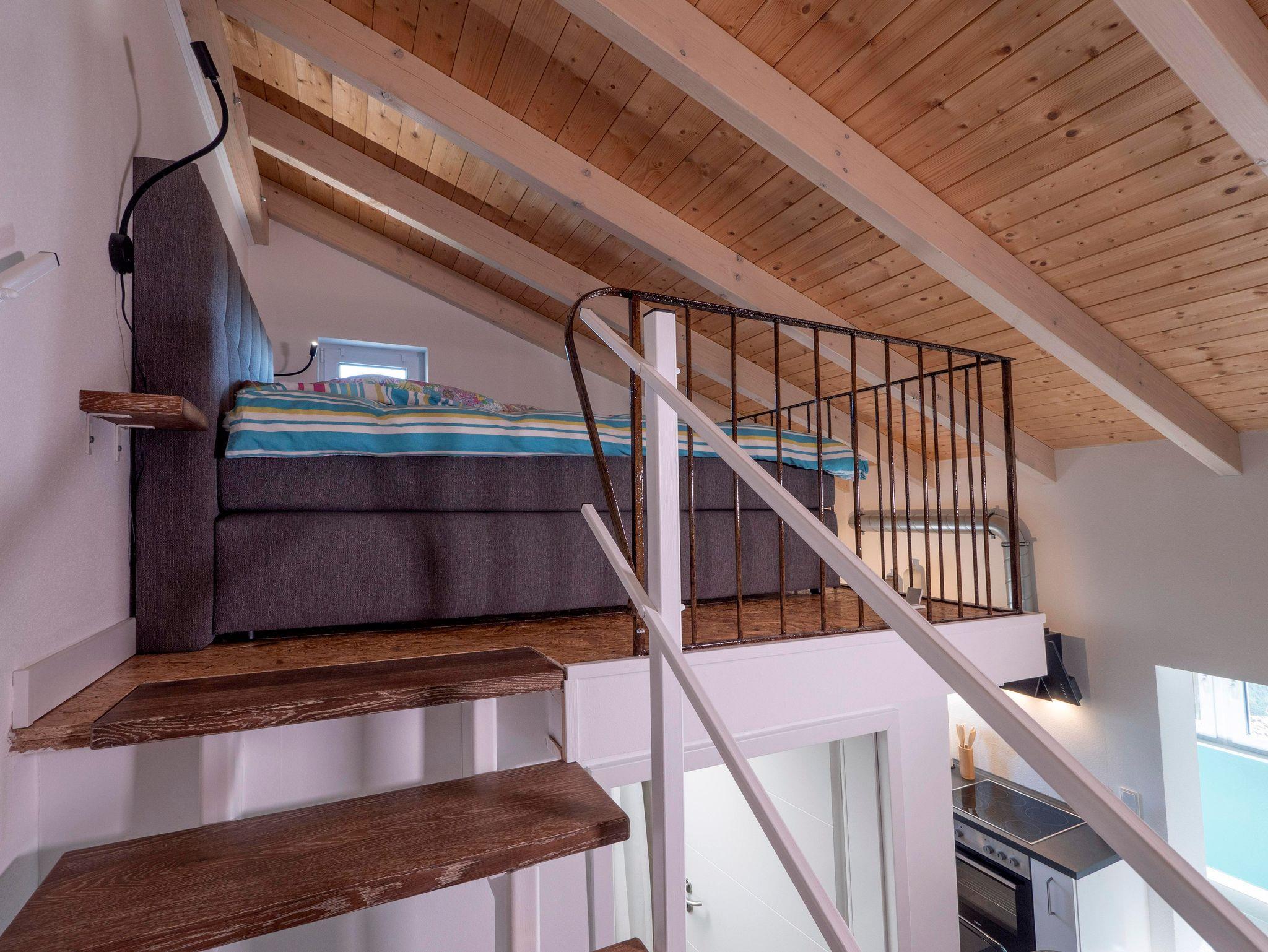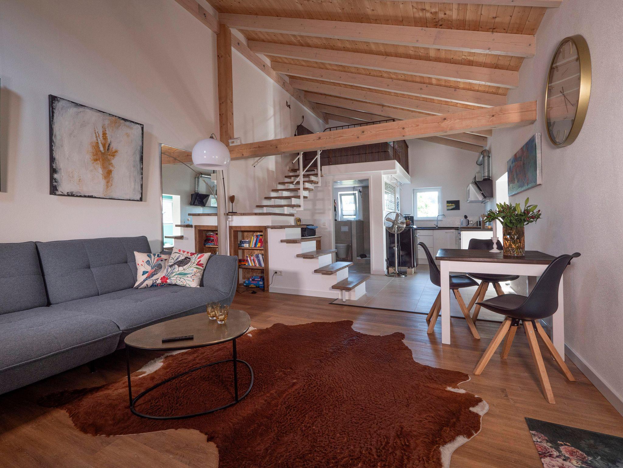 Im Erdgeschoss der Wohnung befinden sich die Wohnküche und das Bad. Der offene Wohnraum besteht aus einem gemütlichen Sofa, welches auch als Schlafmöglichkeit genutzt werden kann.