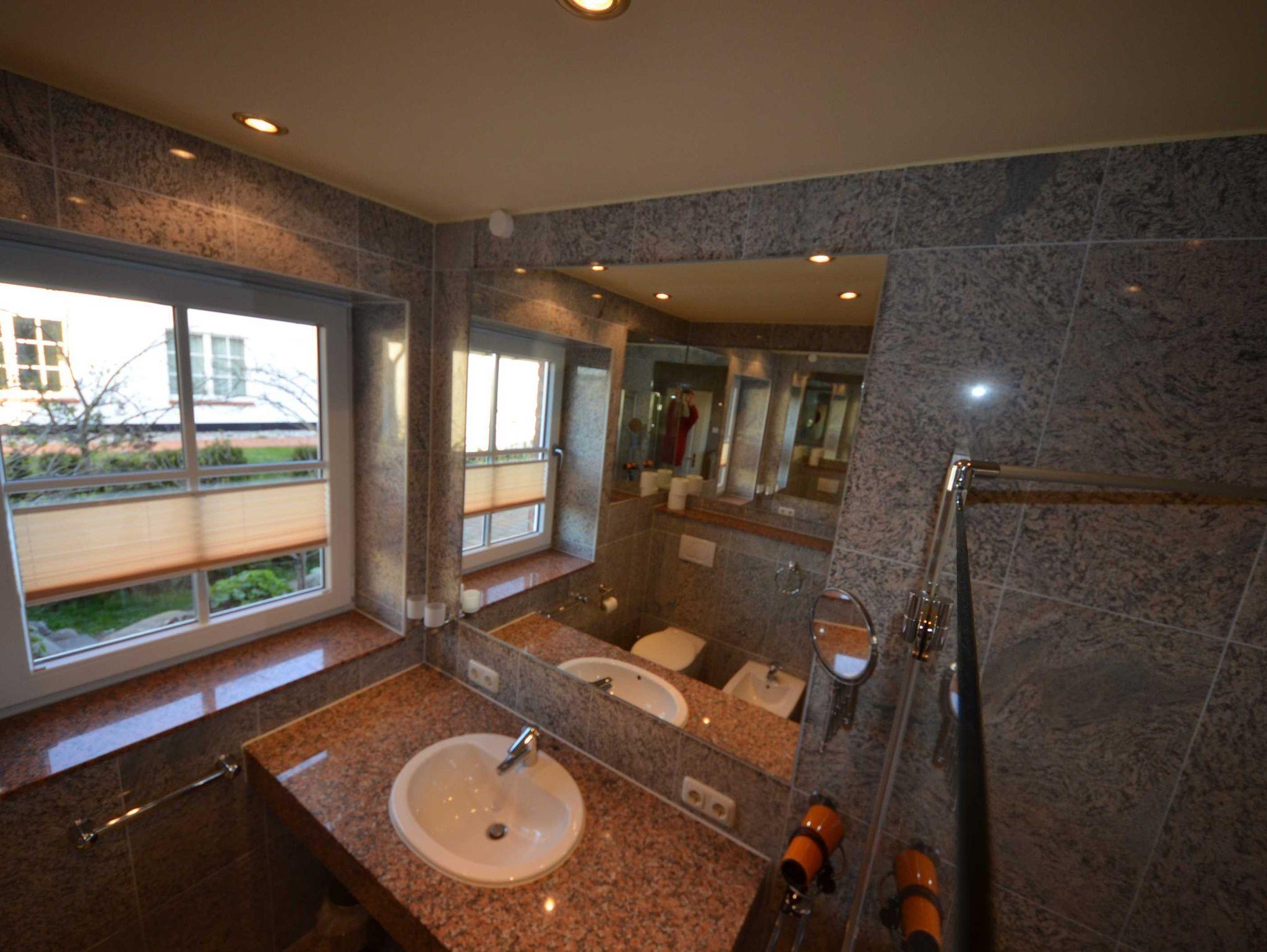 mit Granitabdeckungen, beheizbarer Handtuchhalter, Fön, Schminkspiegel, dekorative Beleuchtung.
