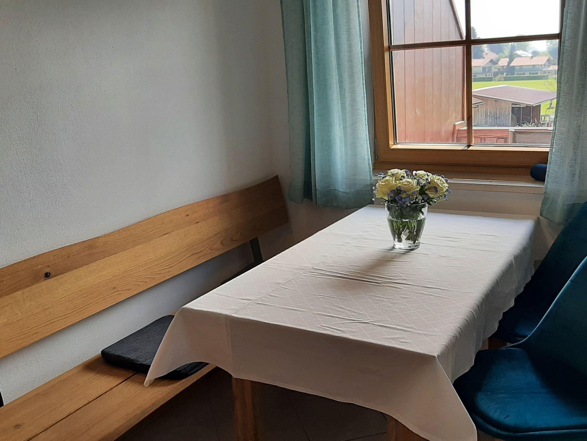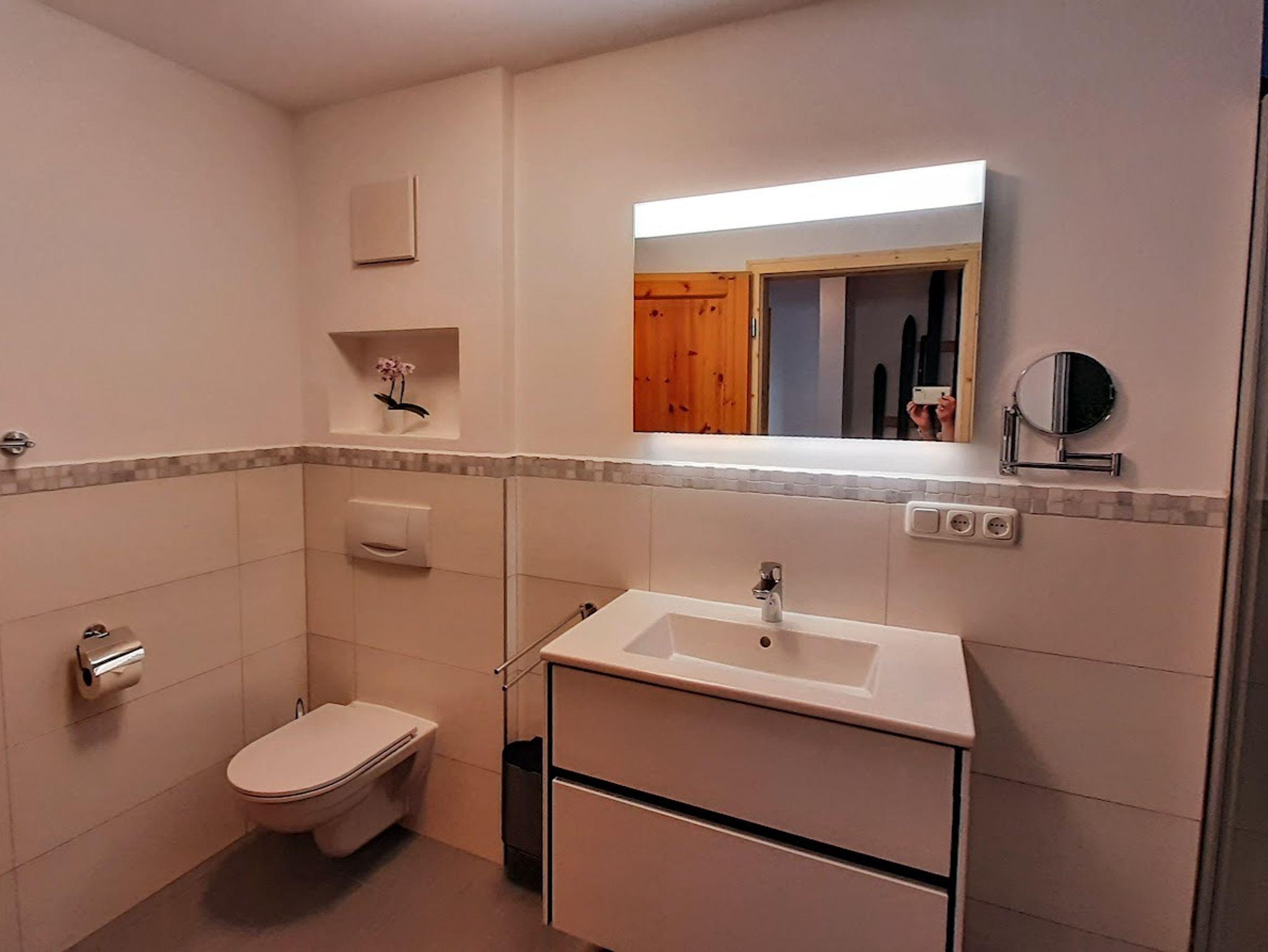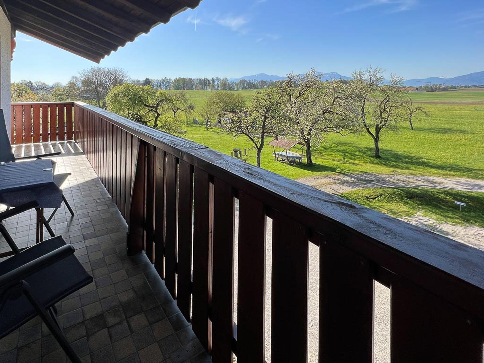 Die hochwertige Ferienwohnung wurde im Winter 22/23 umgebaut und renoviert. Sie liegt im 2. OG des Haupthauses und verfügt über einen Eingangsbereich, eine neue sehr hochwertige Küche mit Essbereich und Sat-TV, ein neues Bad mit großer Dusche und WC, zwei getrennte Schlafzimmer mit erhöhten Doppelbetten. Außerdem gehört ein sehr großer möblierter Süd-Ostbalkon mit freiem Blick auf die Chiemgauer Berge dazu. Die Ferienwohnung ist mit einer Spülmaschine, Induktionsherd, Backofen, Dunstabzug, Kaffeemaschine, Wasserkocher, Toaster, Mixer, DAB-Radio mit CD-Player und W-Lan ausgestattet. Eine Kleinkinderausstattung und Allergikerbetten sind auf Wunsch verfügbar.