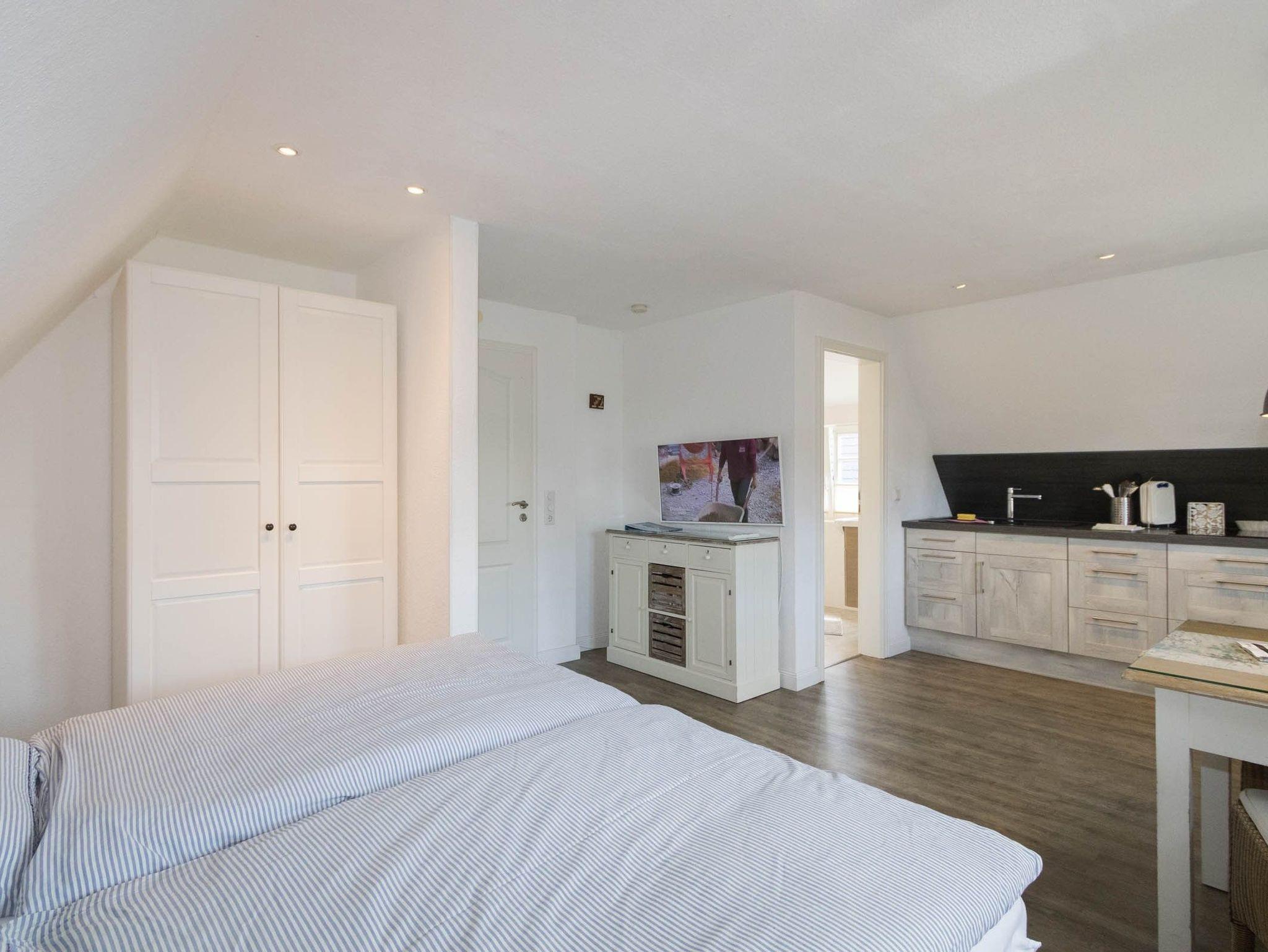 Diese neu renovierte Ein-Raum-Ferienwohnung mit separatem Duschbad ist 28qm groß und befindet sich in unserem Haus. Die Wohnung ist aufgeteilt in einen kombinierten Wohn-/Schlafraum, in dem sich auch die Küchenzeile befindet und ein Badezimmer mit Dusche. Auch die Hünen unter uns können in dieser gemütlichen Wohnung gut schlafen, denn das Boxspringbett ist am Fußende offen. Direkt vor dem Haus befindet sich Ihr Pkw-Stellplatz.