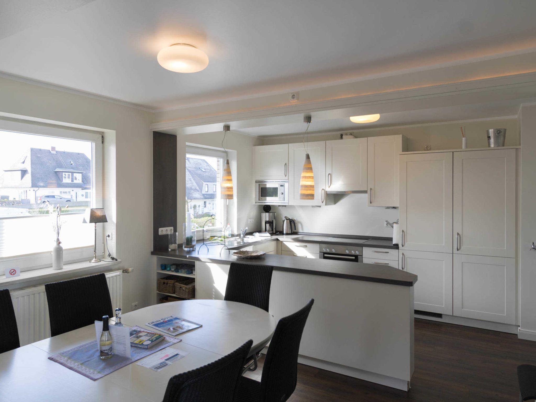 Großzügig und sehr geschmackvoll gestaltet ist der Wohn-/Essbereich mit offener Küche, die keine Wünsche offen lässt. Die Küche verfügt über Geschirrspüler, Backofen, Herd mit Ceranfeld, eine Mikrowelle und einen Kühlschrank mit Gefrierschrank.