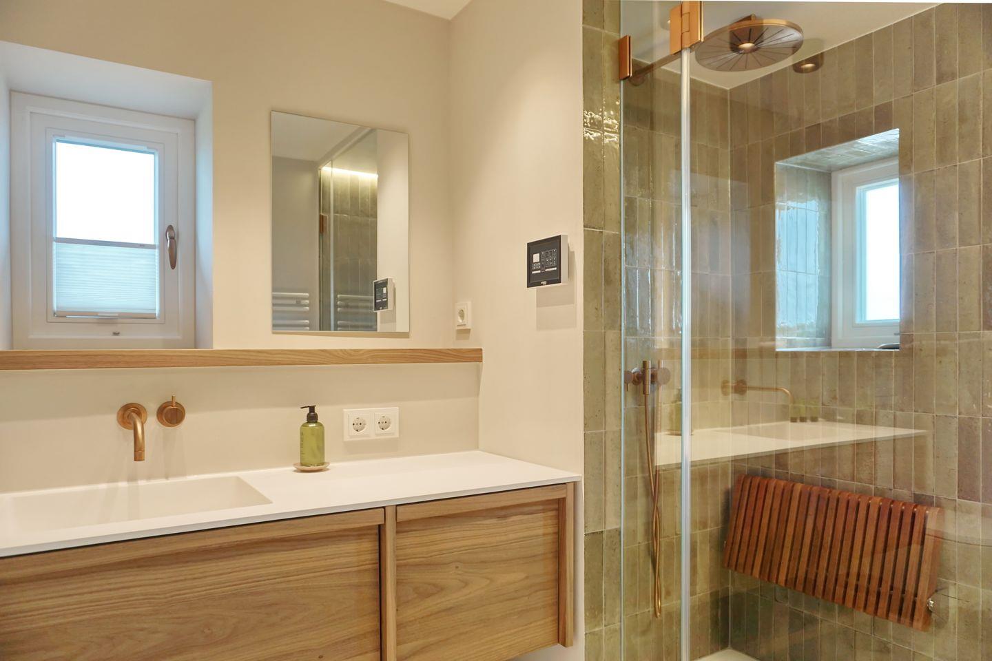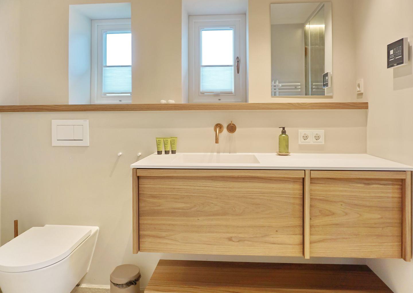 Bad 1: helles, modernes Bad mit WC, Dampfdusche, Einzelwaschtisch mit Fussbodenheizung