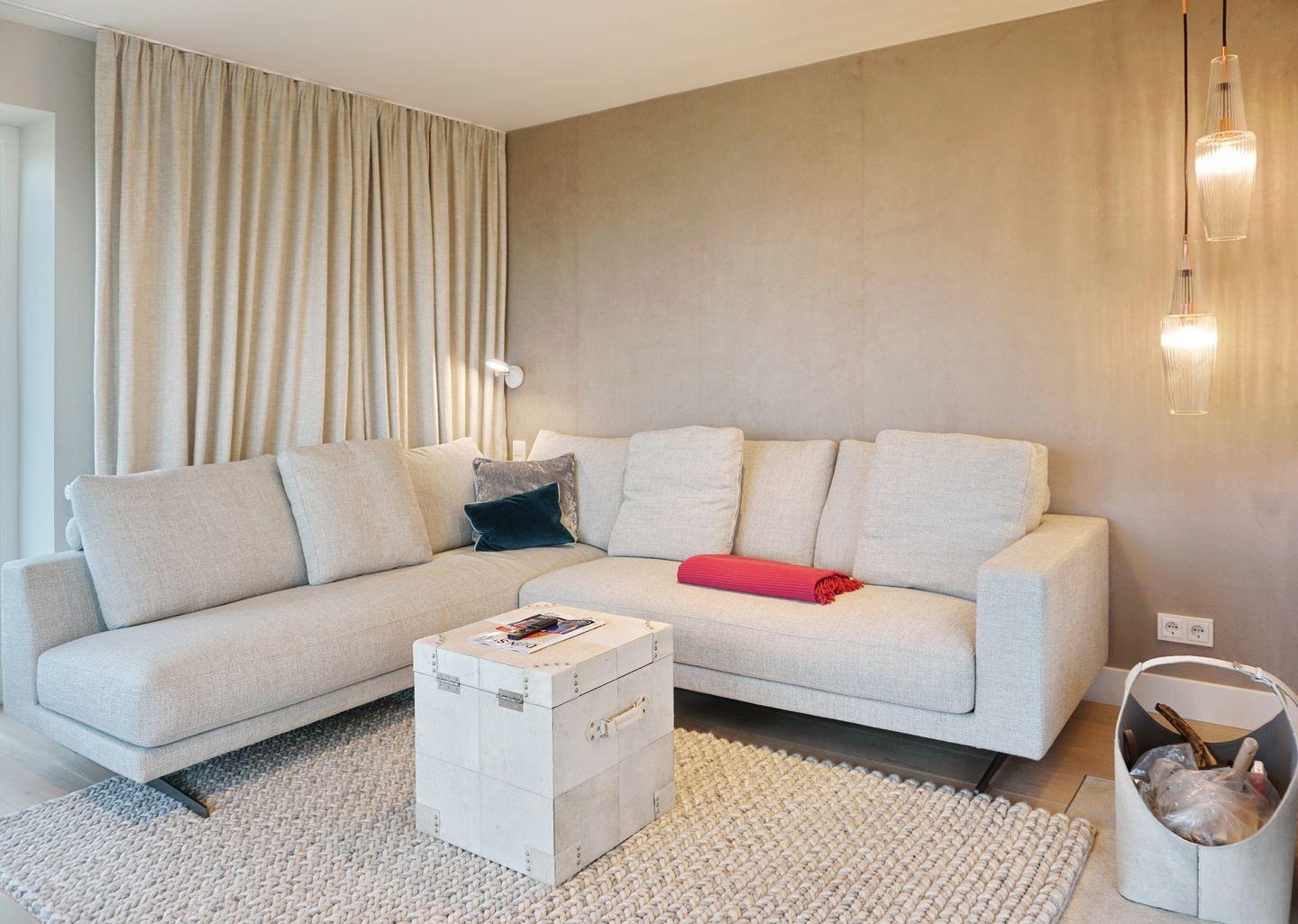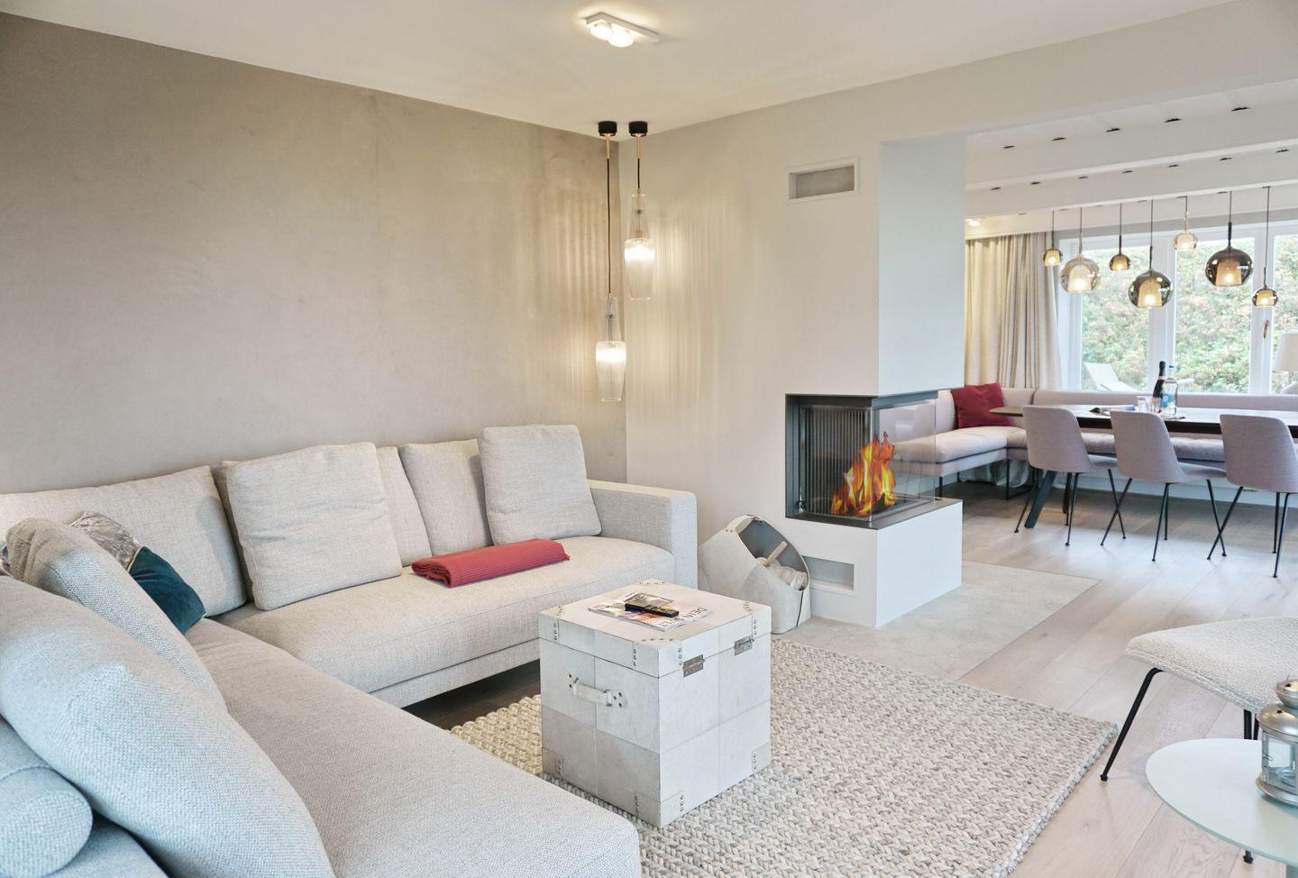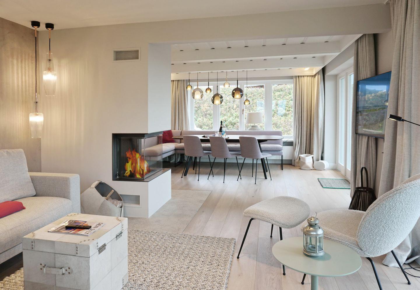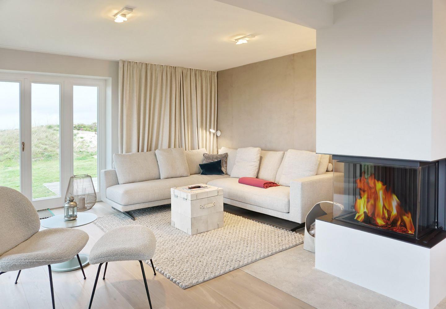 Wohnen: gemütliche Sitzecke am Kamin bestehend aus einer Eckgarnitur mit Flat-TV und wunderschönem Blick aufs Meer und den Sonnenuntergang