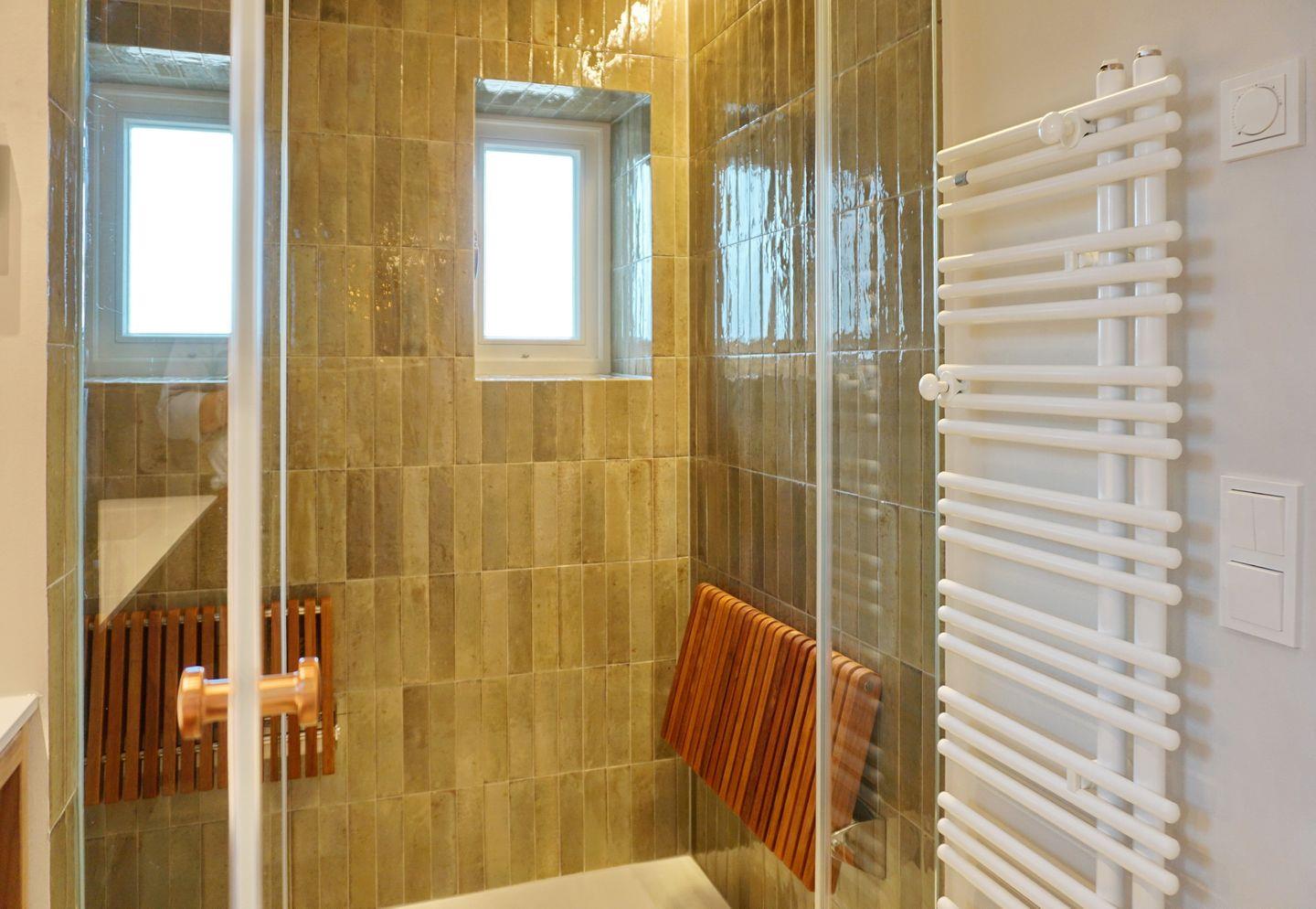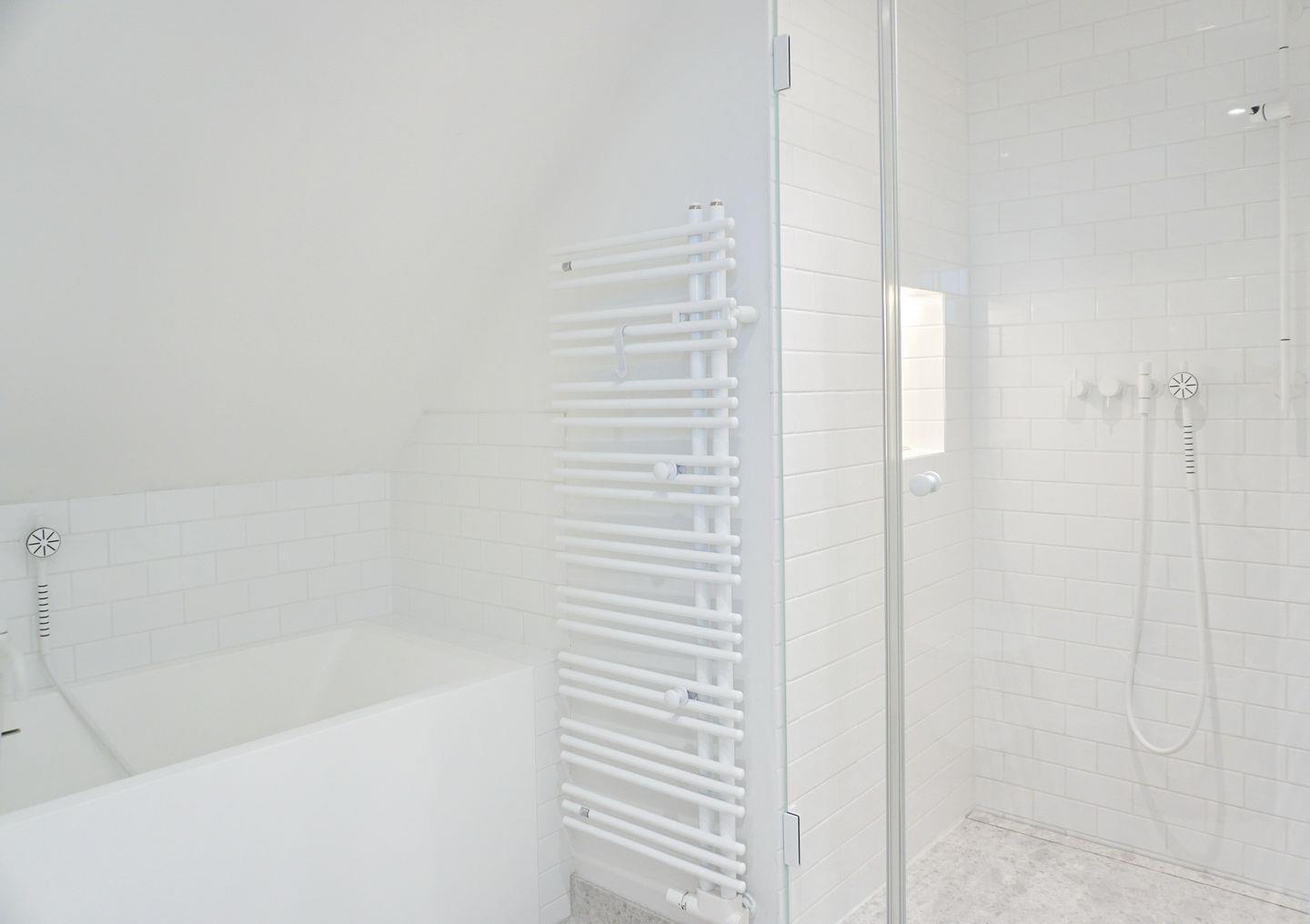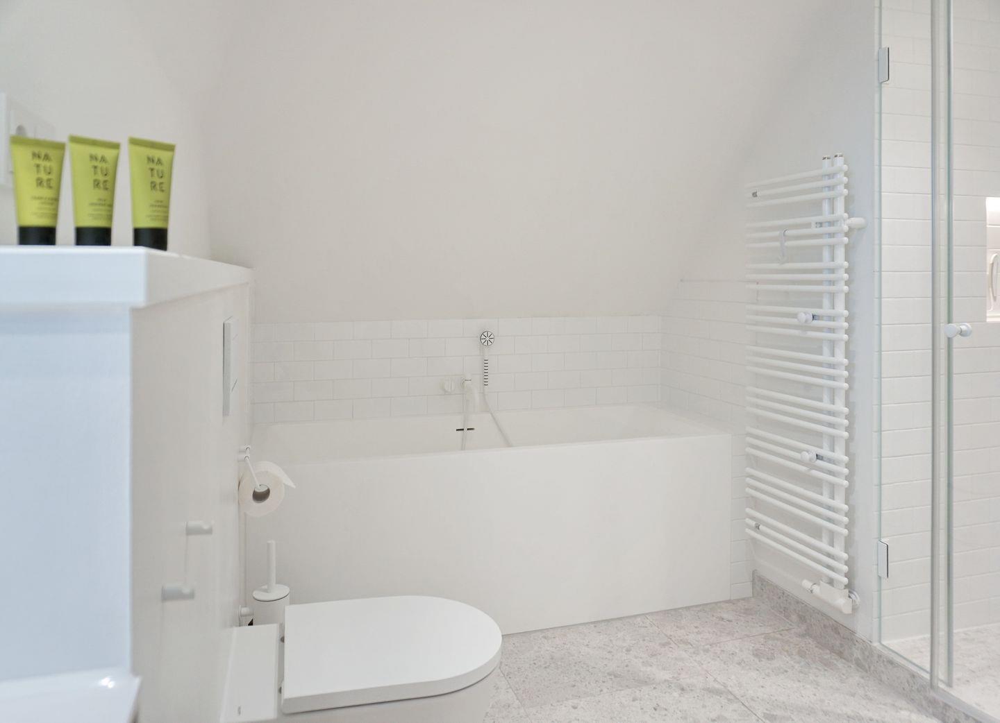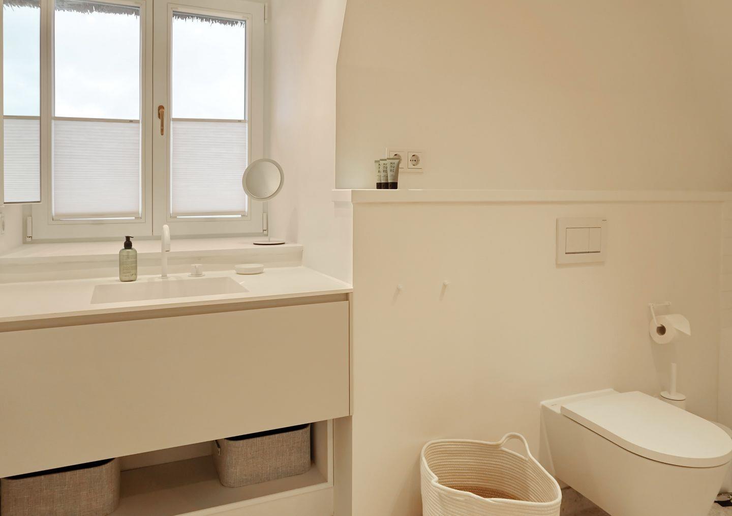 Bad 2: helles, weißes Bad mit Badewanne, Dusche, Toilette , Einzelwaschtisch und Blick aufs Meer, mit Fussbodenheizung