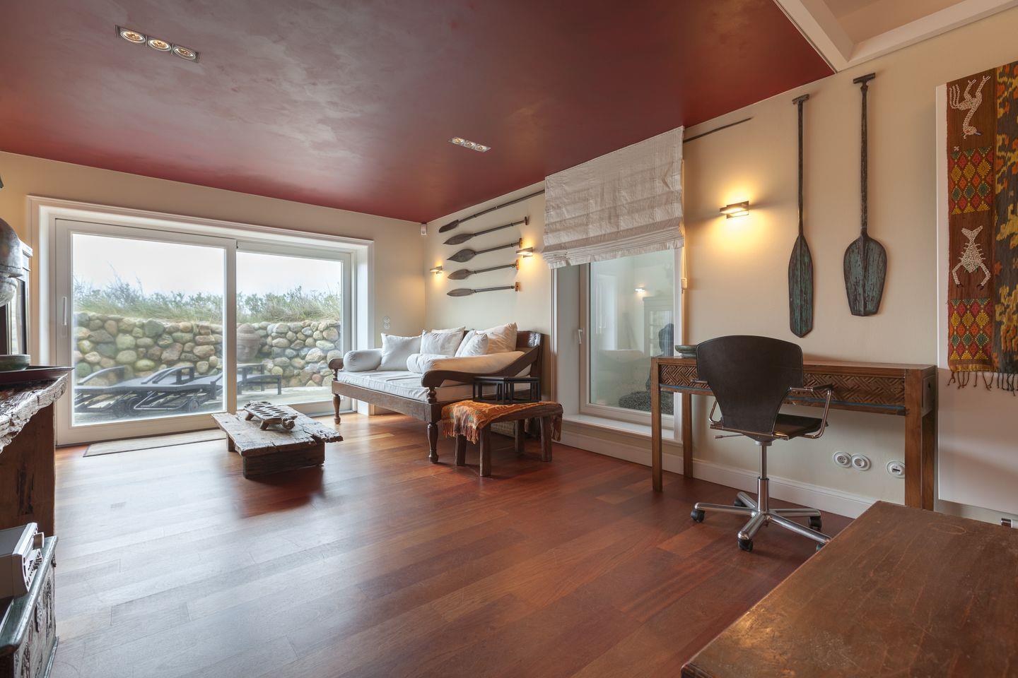 Steter Blickfang ist die prächtige, über die ganze Erdgeschossfläche verlaufende Glas-Veranda, die durch große Schiebe-Elemente aus Glas zu öffnen ist - es stellt sich ein fantastisches Wohngefühl durch stetig wechselnde Lichtspiele über dem Meer ein, das man einfach erlebt haben muss. Die Veranda lädt zu einem superben Open-Air Erlebnis, das Sie auf Ihrem edlen Outdoor-Lounge Mobiliar genießen können. Die zweite Möglichkeit, das eindrucksvolle Schauspiel des Meeres zu inhalieren, bietet Ihnen eine Süd-West Panorama-Terrasse mit Sitzbank- und Tischensemble im massiven, puristischen Treibholz-Stil. Wem das noch nicht reicht, den macht dann wahrscheinlich ein reetgedeckter (!) Tee-Pavillon, für besonders schöne und romantische Sonnenuntergänge über dem Meer vollends sprachlos.