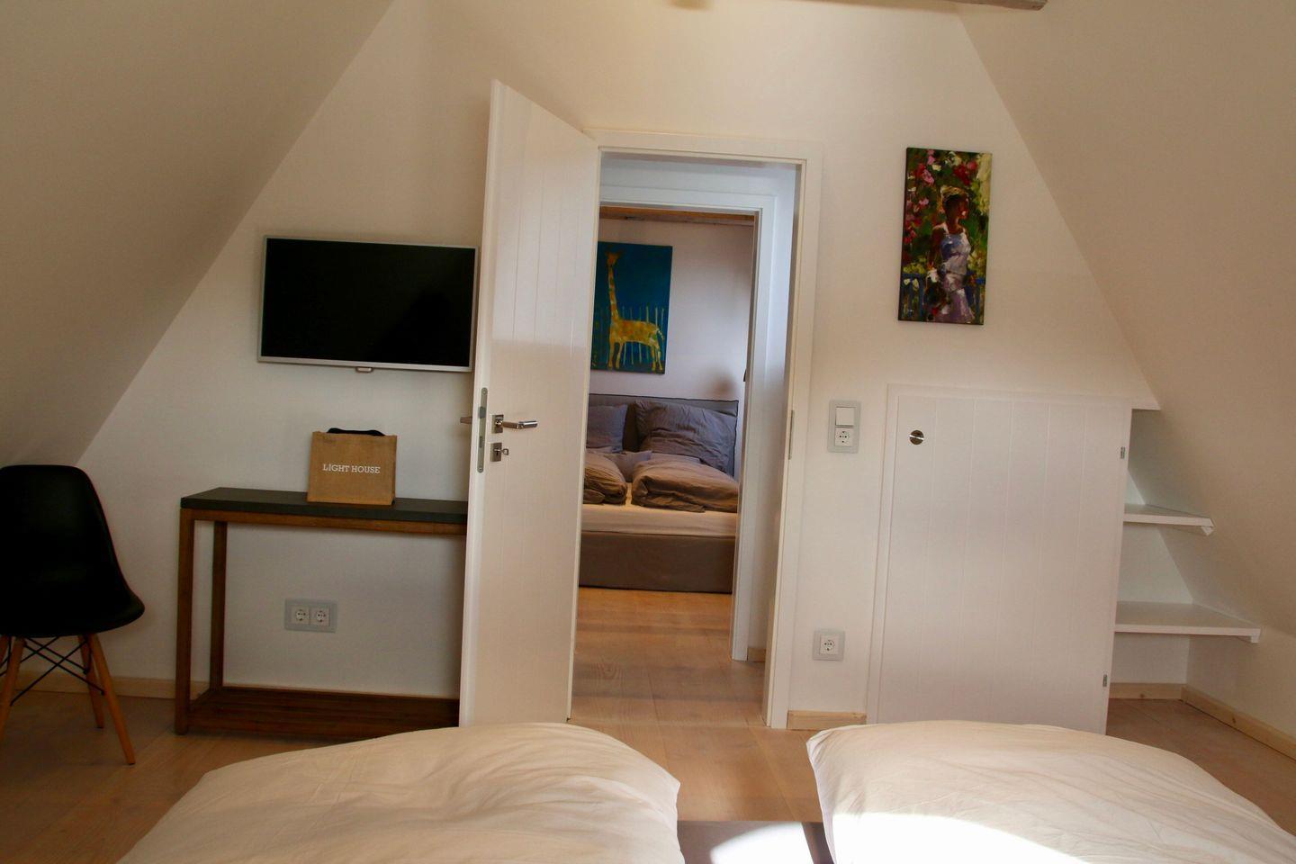 Das Haus verfügt über vier komfortable Schlafzimmer mit Doppelbetten. Alle Schlafzimmer sind mit hochwertigen Gervasoni-Betten ausgestattet, von denen zwei im Dachgeschoss und zwei im ersten Stock liegen.