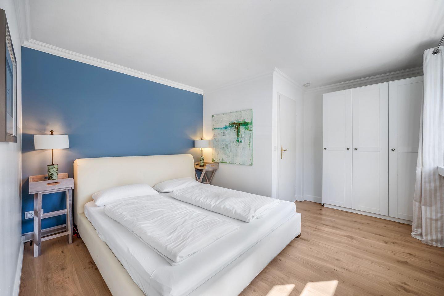 Im separaten Schlafzimmer steht ein französisches Bett zur Verfügung. Viel Stauraum in Schränken mit Ablagesystem sorgt dafür, dass alles ordentlich untergebracht werden kann.
