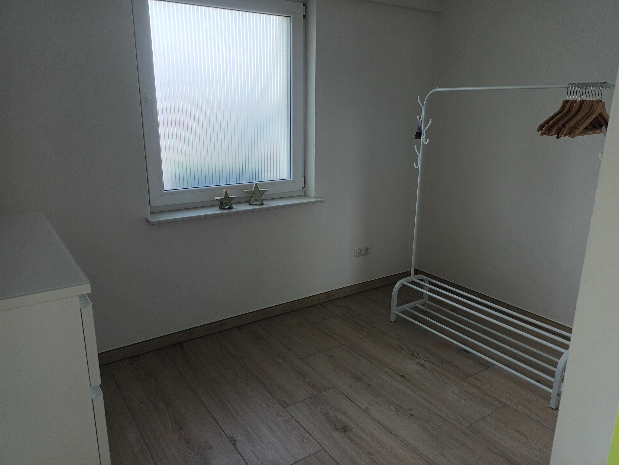 - Das Schlafzimmer mit Doppelbett und angrenzenden Ankleidezimmer mit Kommode und Kleiderständer.