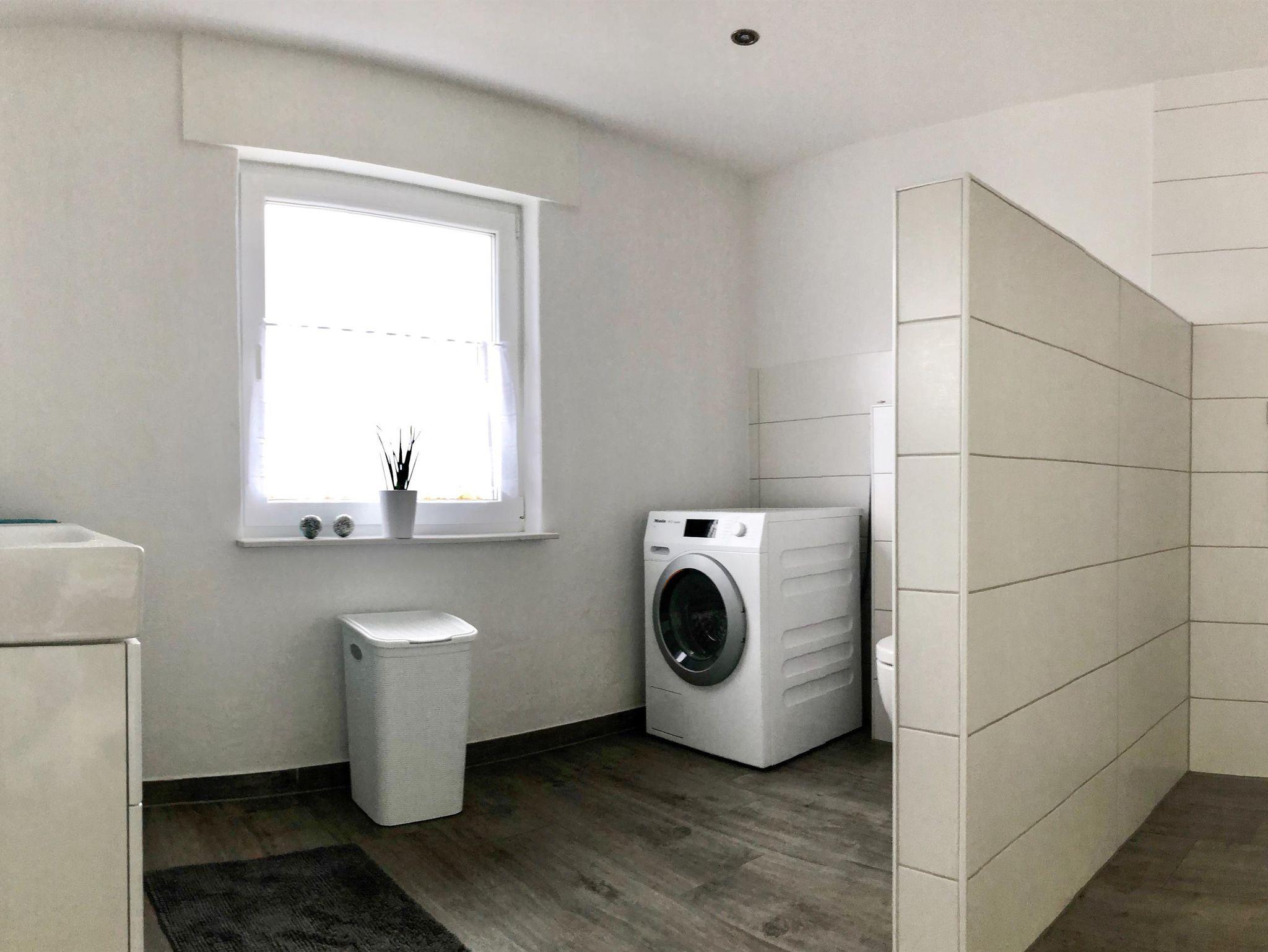 - Das Bad mit WC, ebenerdiger Dusche, Waschtisch, Spiegel, und Waschmaschine.