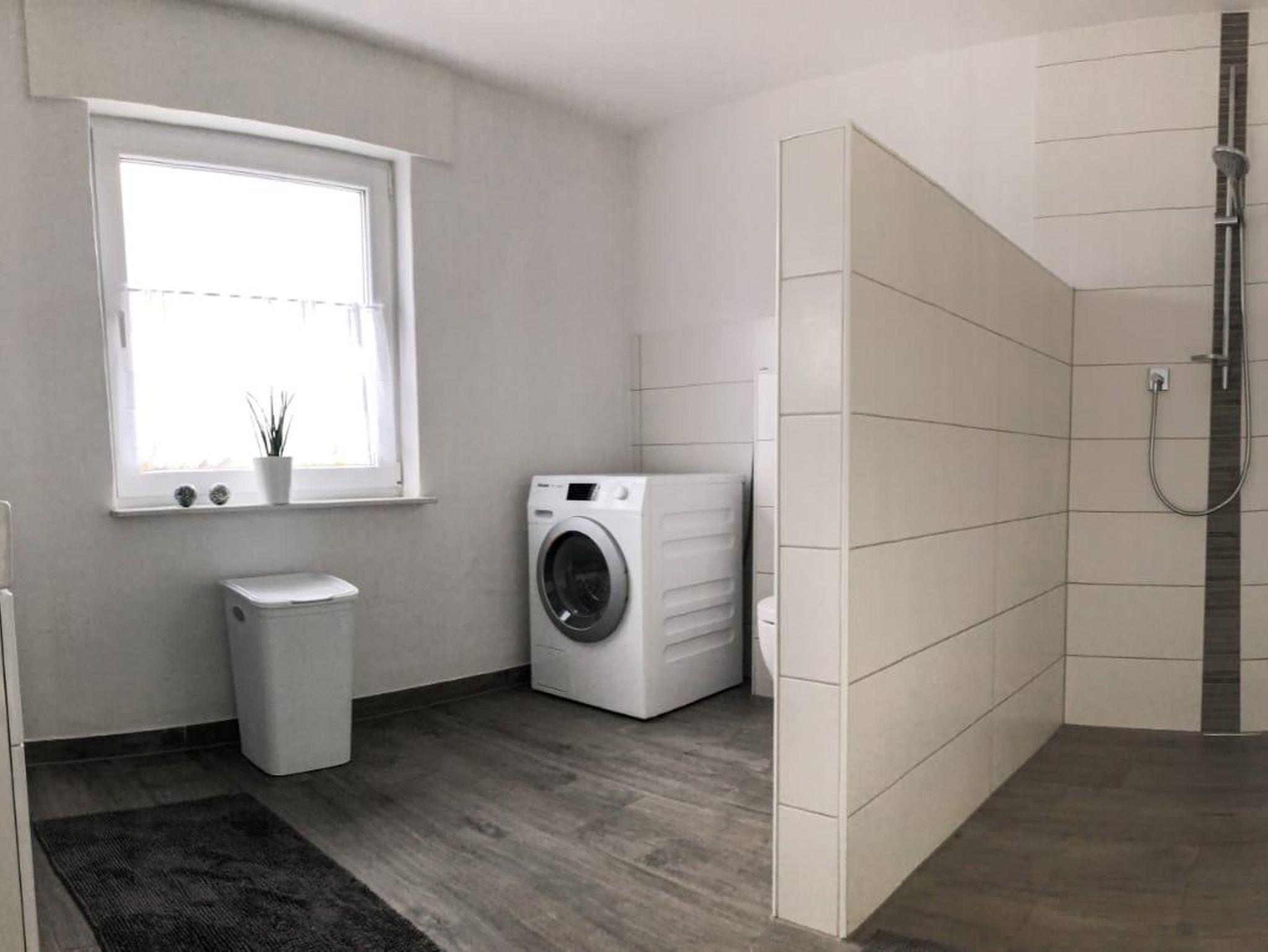 - Das Badezimmer mit ebenerdiger Dusche, WC Waschtisch, Spiegel, Waschmaschine und Wäscheständer.