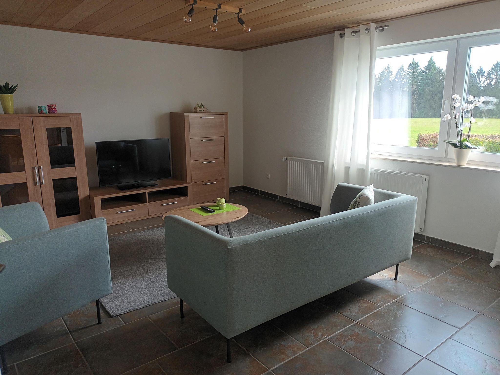 - Das Wohnzimmer ist mit einem Sofa, Sessel, Wohnwand und Sat-TV.