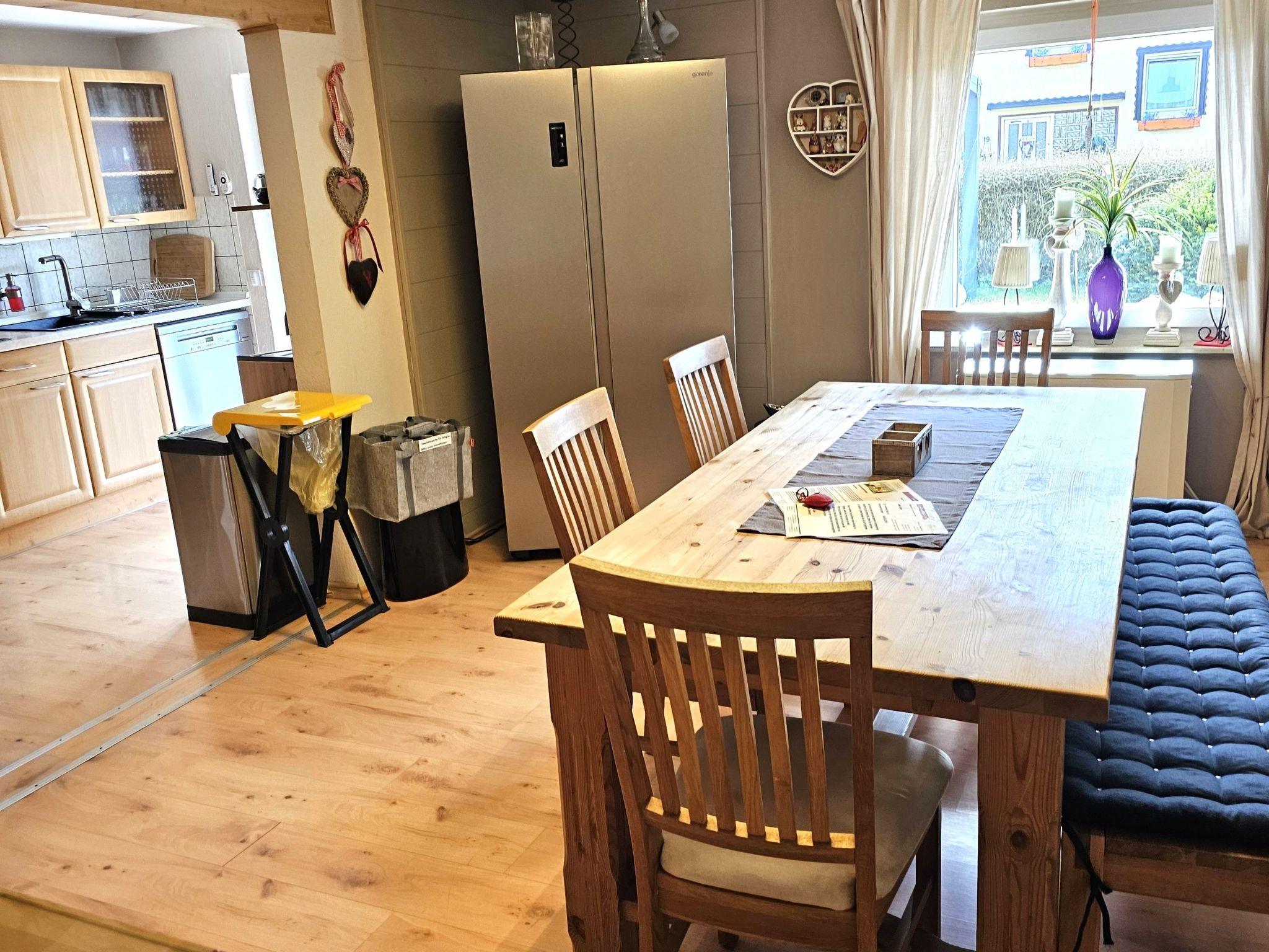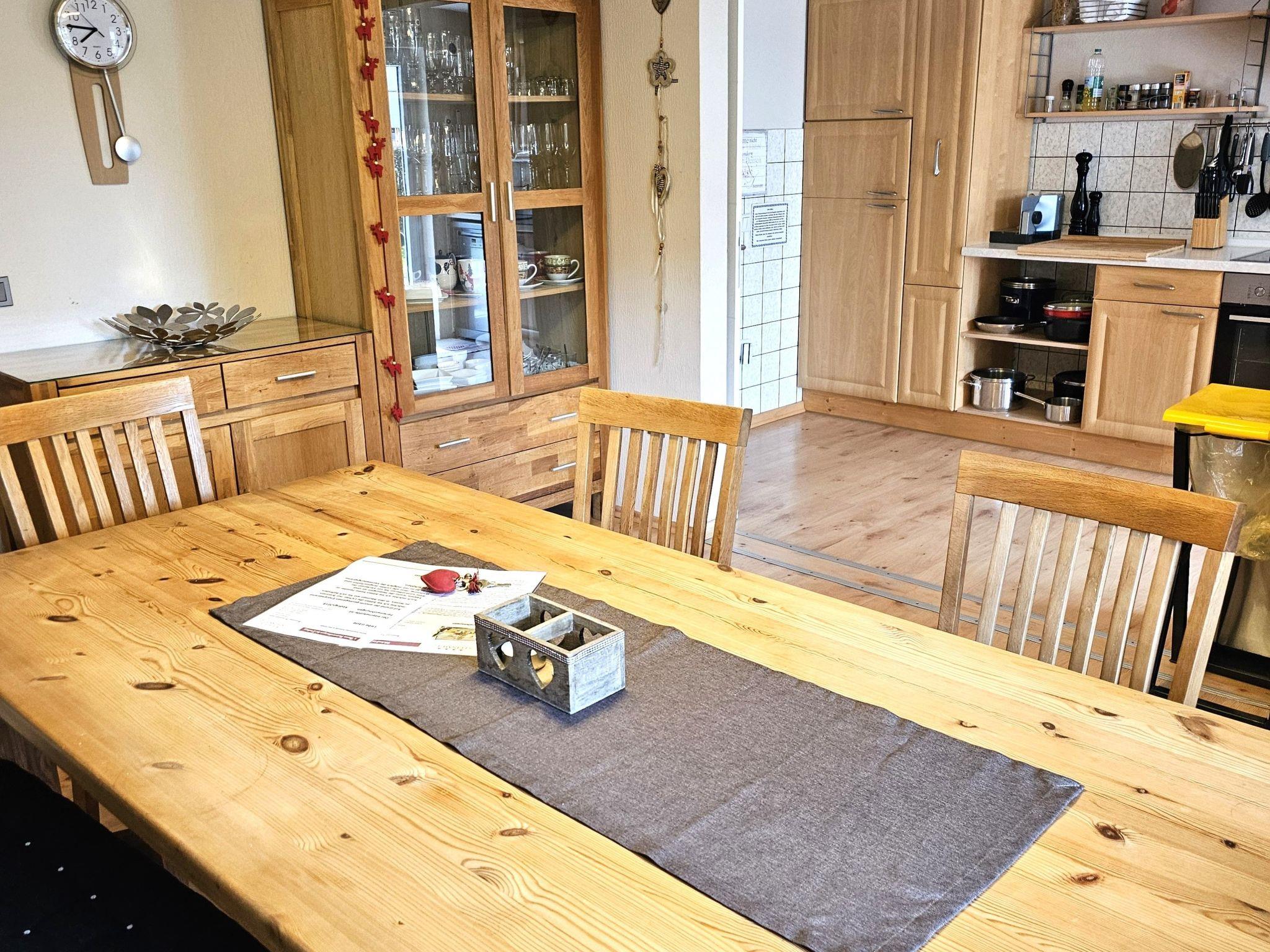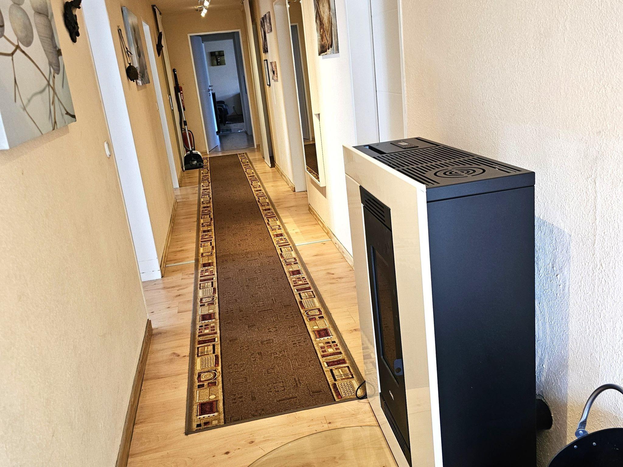 Eine voll ausgestattete, offene Küche mit allen Utensilien und Geräten, mit Zutritt auf eine große überdachte Terrasse, sowie ein schönes Wohnzimmer ermöglichen das gemütliche Miteinander. Das zur Küche angeschlossene Echtholz Esszimmer lädt zum stilvollen Speisen ein. Im Flur befindet sich für die kälteren Tage ein Pelletofen (Pellets incl.)der in der ganzen Wohnung für eine gemütliche Raumtemperatur sorgt. Im großen Schlafzimmer ist ein Kaminofen (Brennholz inklusive) für romantische Stunden. Ansonsten gibt es Infrarotheizungen.
