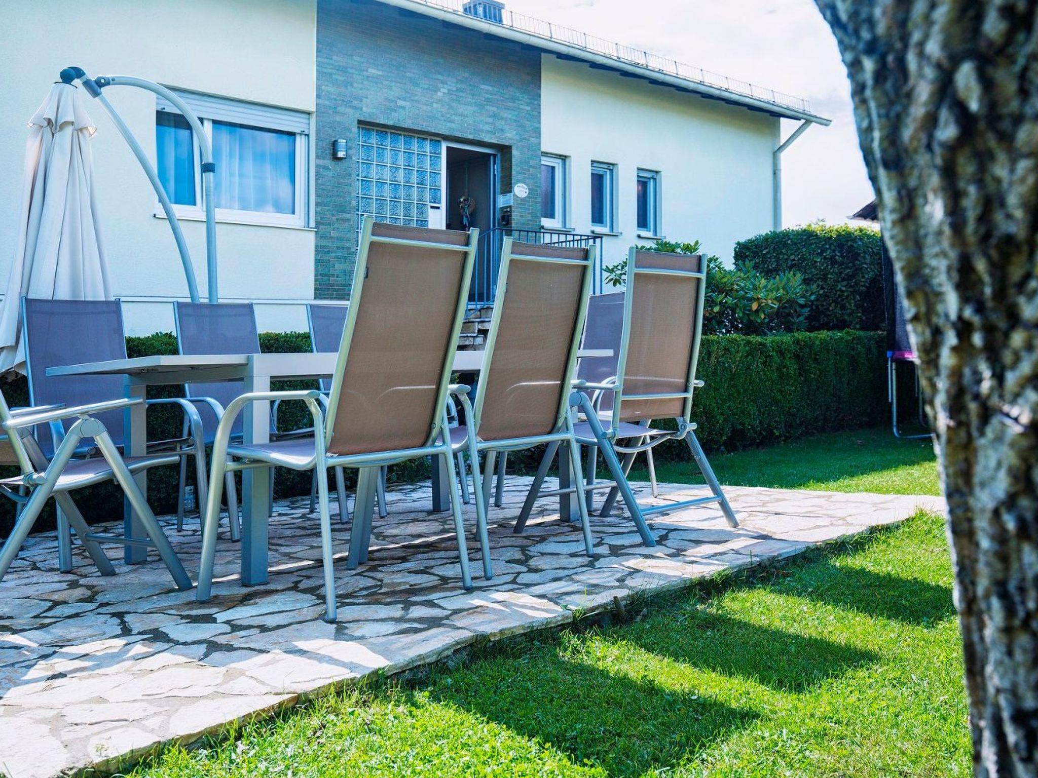 Der Garten mit Gartenmöbeln, einem Schwenkgrill, einem Trampolin und einer Tischtennisplatte kann beliebig genutzt werden.