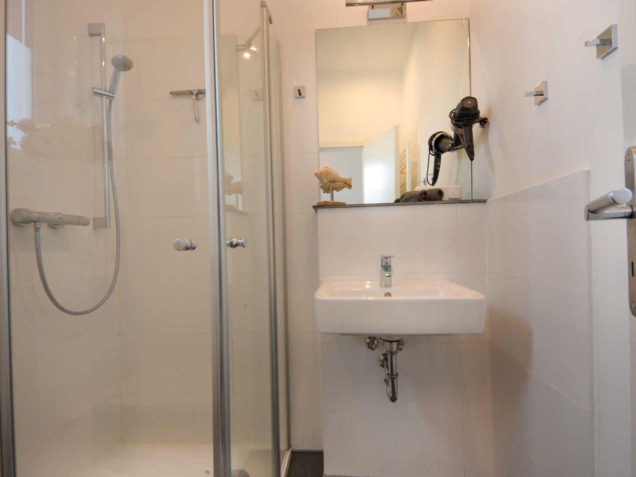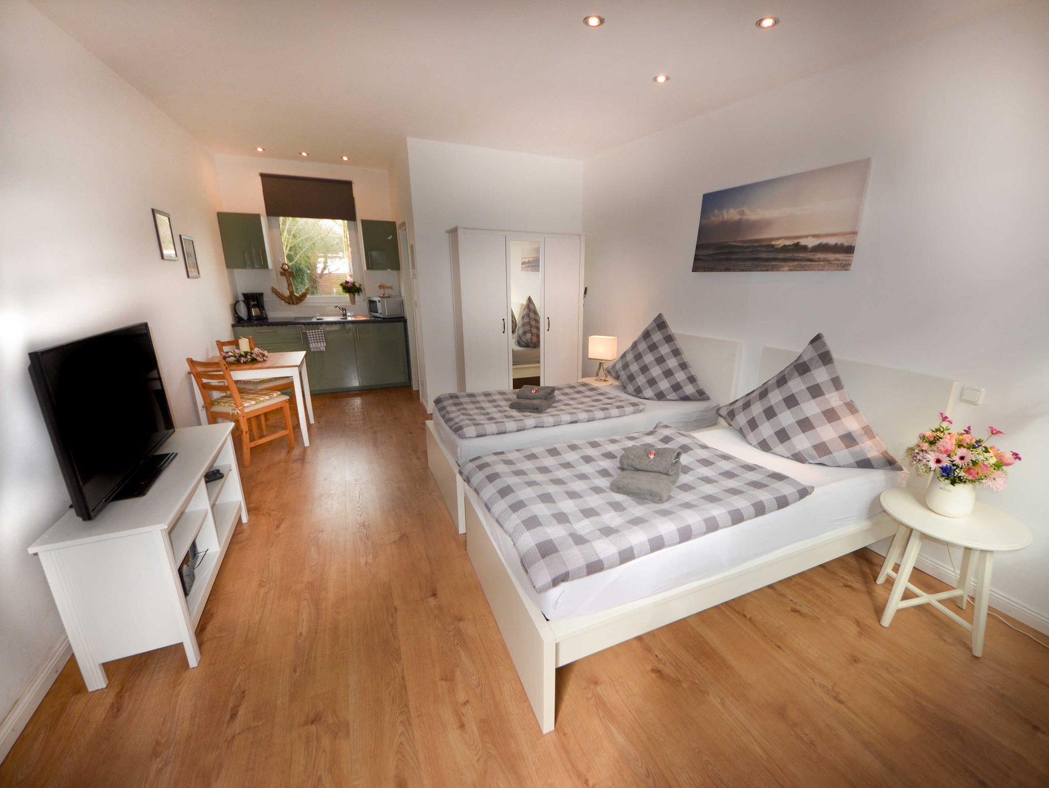 In der Wohnung H7 befinden sich zwei Einzelbetten (90 cm x 200 cm), die man zusammenstellen kann, ein hochwertiges Granit- Duschbad, eine Einbauküche und ein Essplatz für 2 Personen.