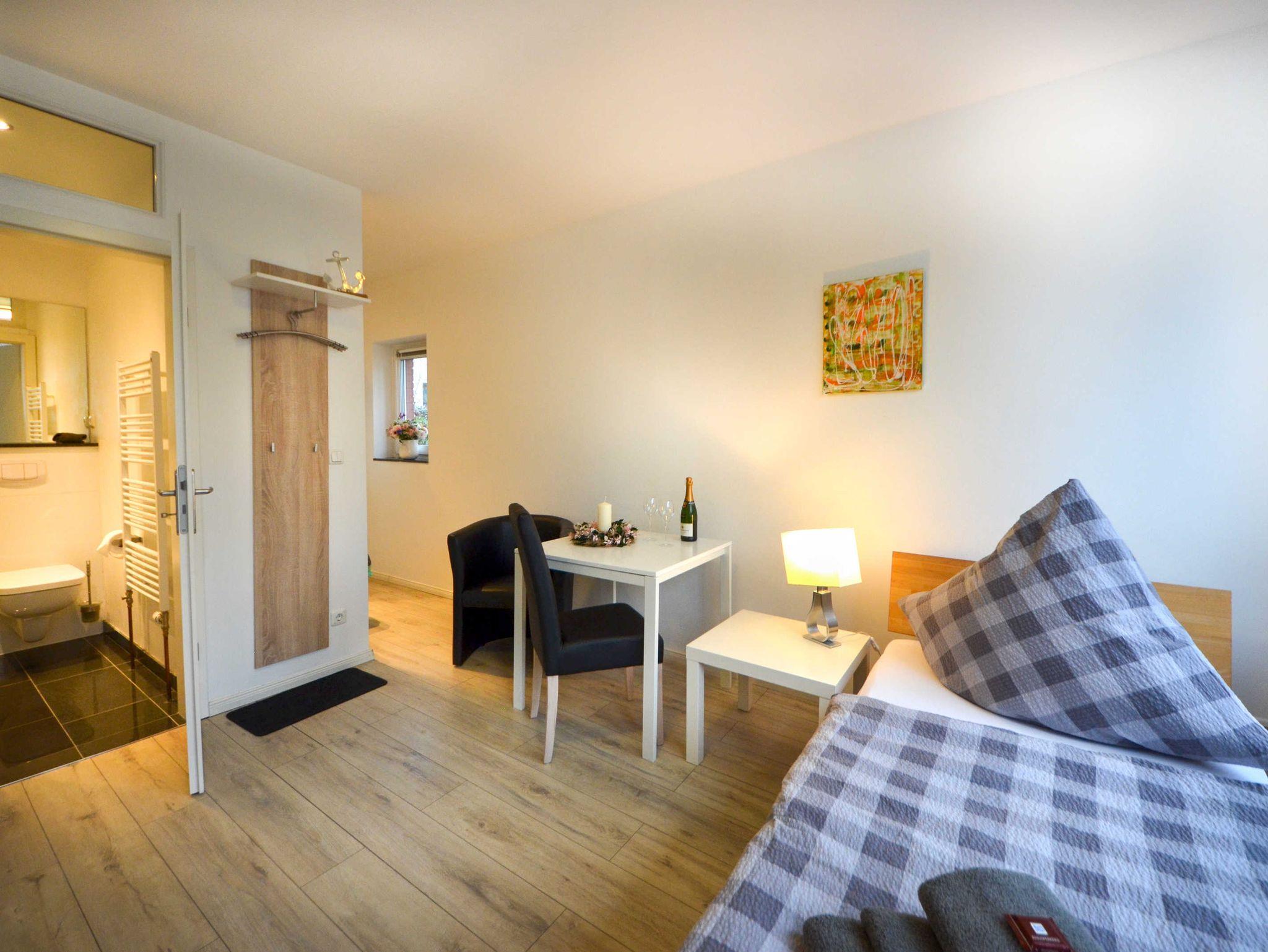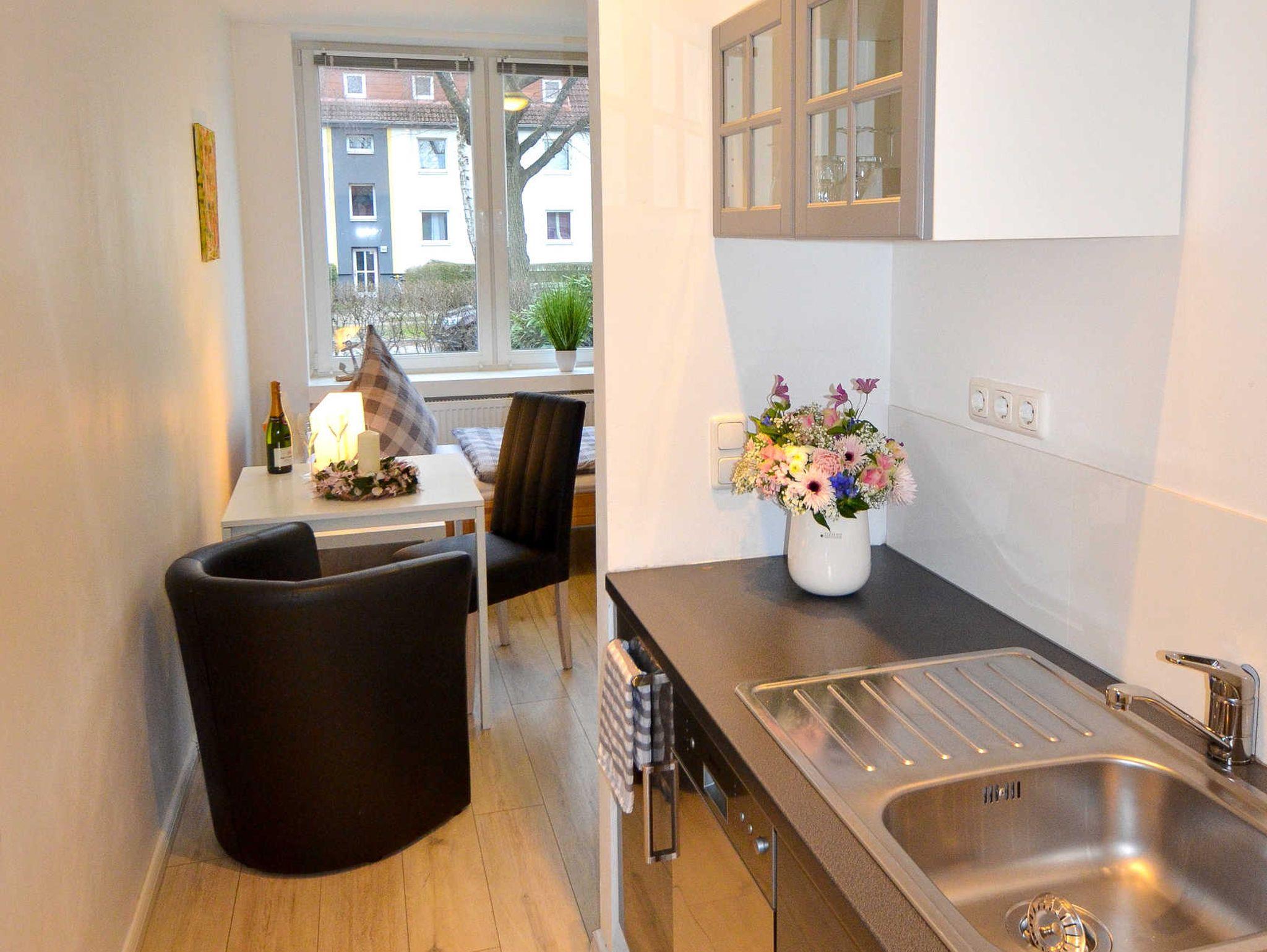 Unser 1-Zimmer-Appartment W1 in Hamburg Horn verfügt über alle Annehmlichkeiten, die einen im Urlaub nichts vermissen lassen. Ein schönes Duschbad aus Granit und eine Einbauküche mit Geschirrspüler fügen sich perfekt ein in die gemütliche Wohnlandschaft, die schlicht Ton in Ton eingerichtet ist. Gemütlich lädt ein Esstisch mit Cocktailsesseln für zwei Personen zum Verweilen ein – alles in nordisch schlichter Eleganz. Die zwei Einzelbetten im Schlafbereich lassen sich zusammenschieben.