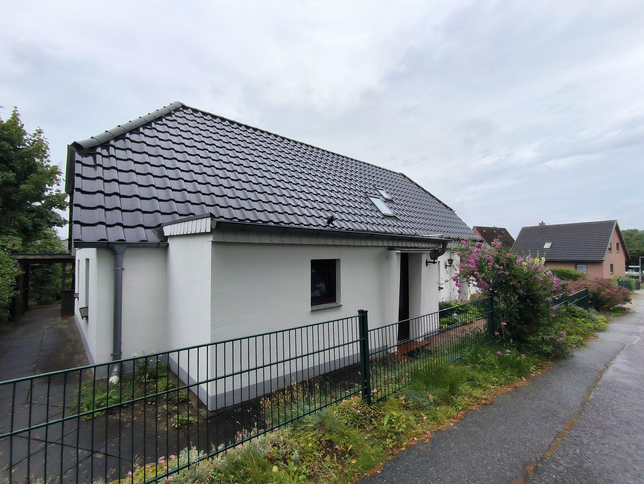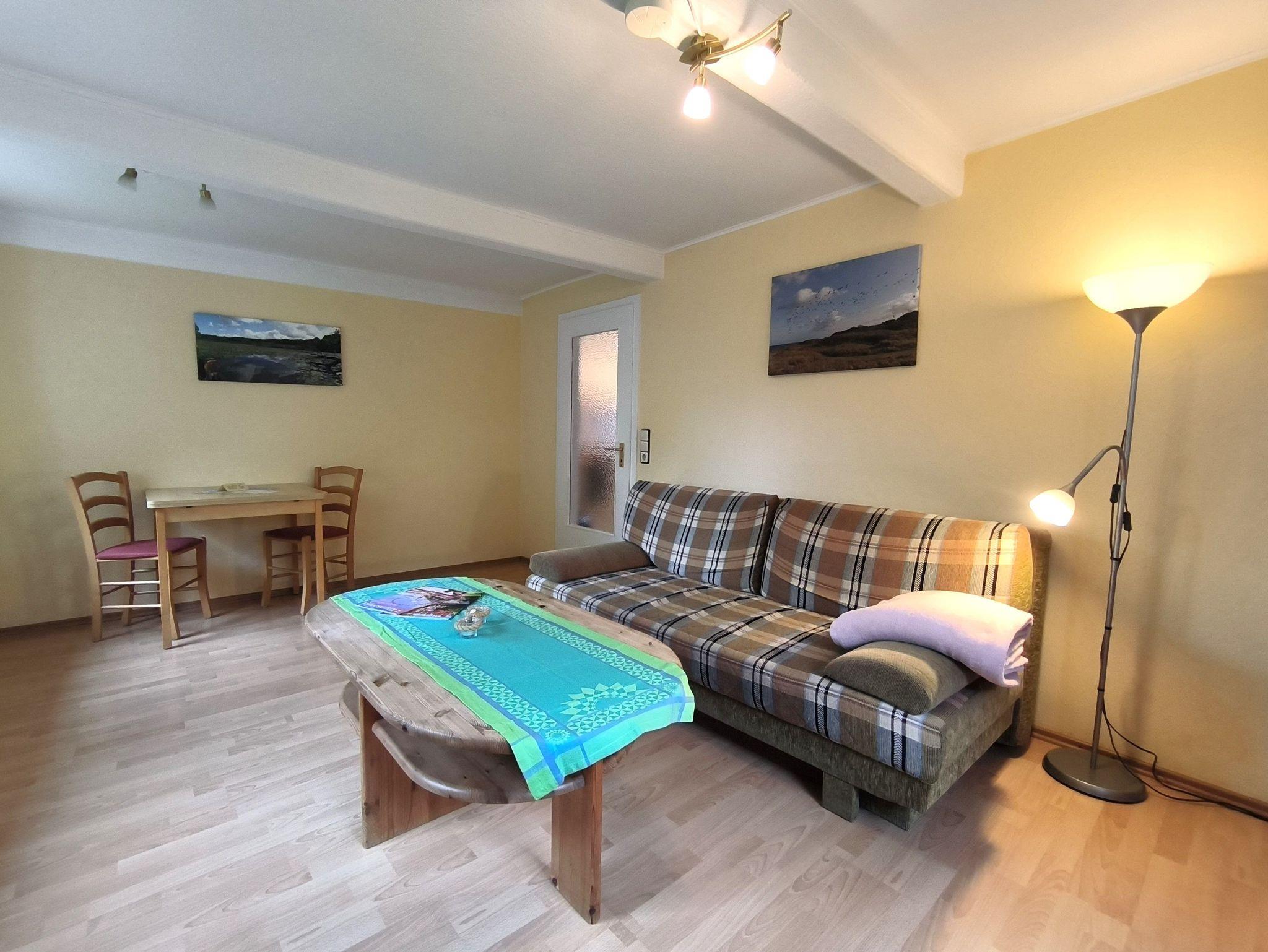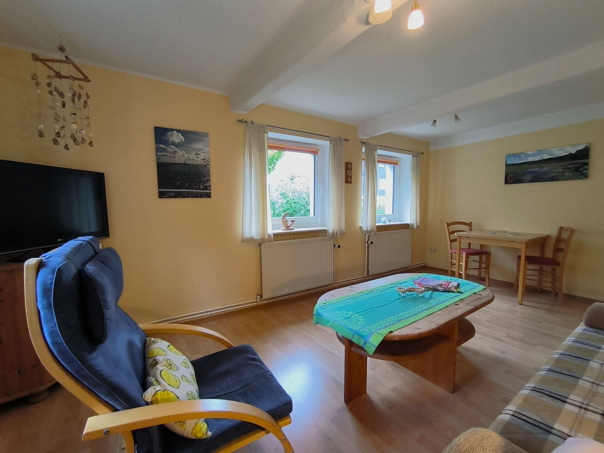 Im Eingangsbereich der Wohnung geht vom kleinen Flur das moderne Badezimmer mit Toilette, Waschbecken und Dusche und Fenster ab. Vom Flur weiter geradeaus geht es in die gut ausgestattete Küche (Kochfeld, Backofen, Wasserkocher, Kaffeemaschine) mit Esstisch und Stühlen. Von der Küche gehen das Schlafzimmer und das Wohnzimmer ab. Im Schlafzimmer gibt es ein Doppelbett (zwei zusammengestellte Betten) und einen großen Kleiderschrank. Das Wohnzimmer ist mit Sofa, Lesesessel, TV und noch einem kleinen Tisch ausgestattet. Zur Ferienwohnung gehört eine kleine Gartenlaube hinter dem Haus und mit Blick in den hübschen Garten: hier können sie windgeschützt und trocken sitzen.