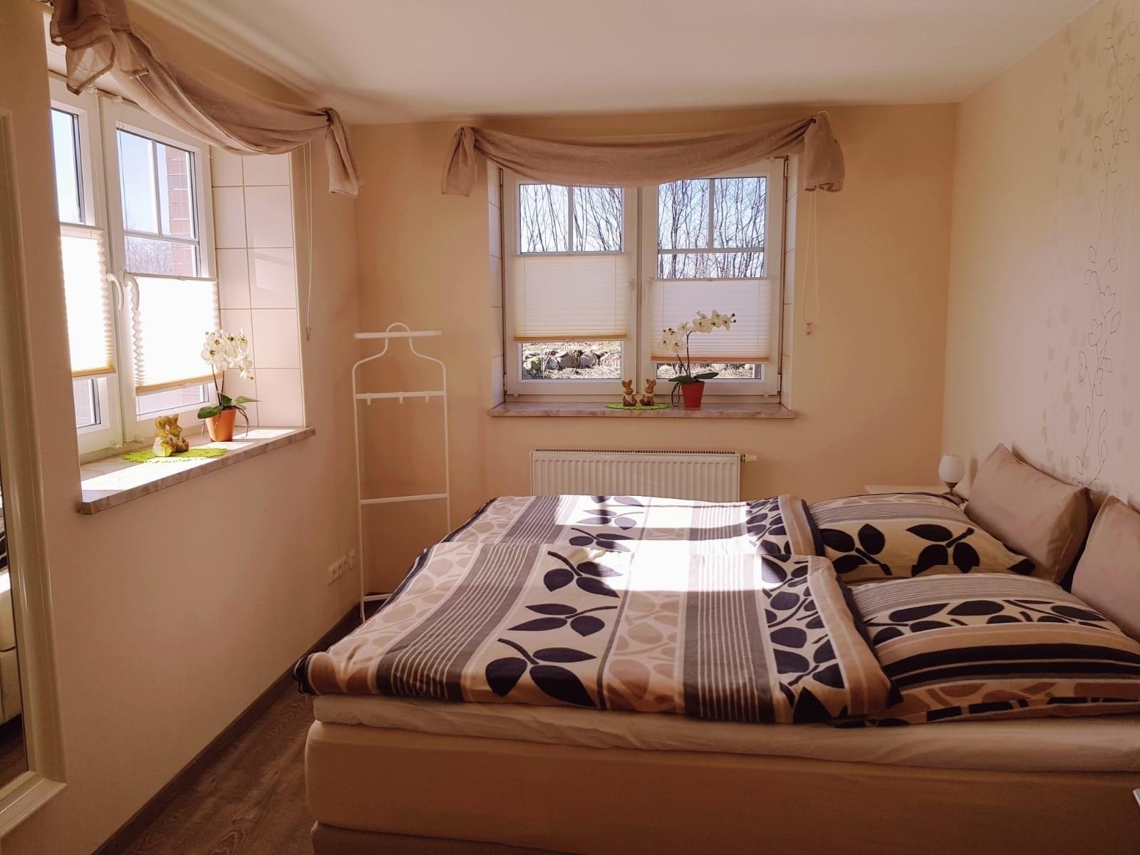 Die beiden Schlafzimmer sind mit Design-Planken in Holzoptik als Bodenbelag und Boxspringbetten ausgestattet, die ein besonderes Schlaferlebnis garantieren. Auch hier geben Schränke und Nachtkonsolen in weißem Landhausstil den Räumen Licht und Freundlichkeit. Großzügig bemessene Schränke schaffen genügend Stauraum. Im "Elternschlafraum" steht Ihnen auf Wunsch Bettzeug in Komfortgröße zur Verfügung.