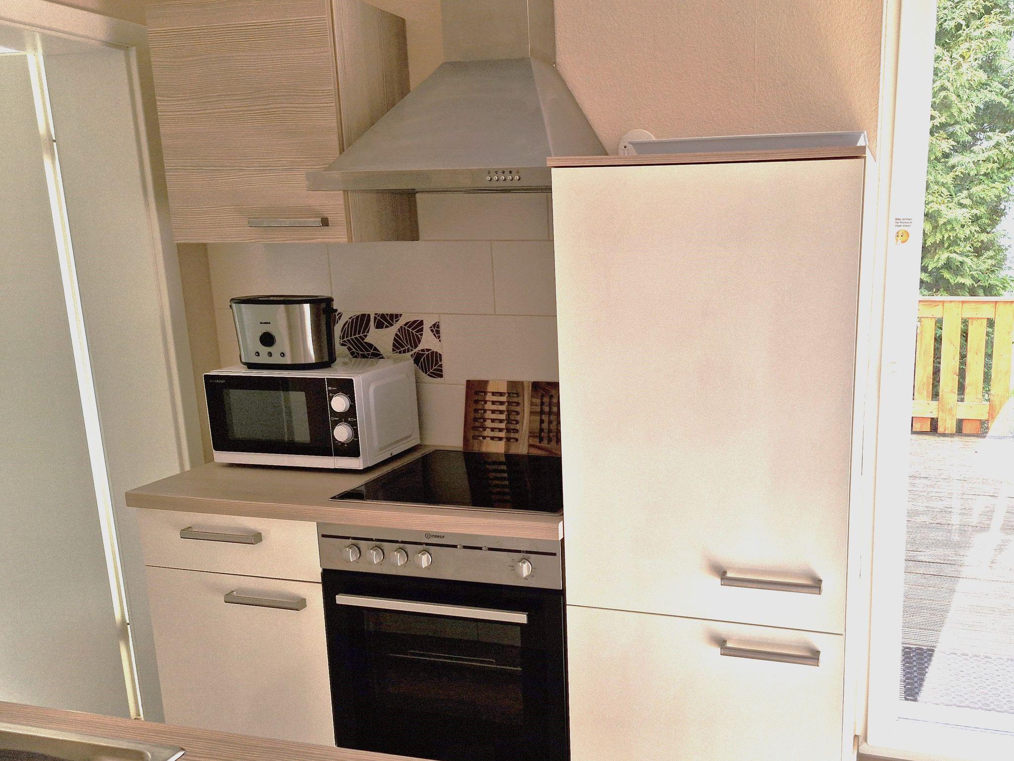 Die offen gestaltete, komfortable Küche ist voll ausgestattet mit Toaster, Kaffeemaschine, Herd mit Backofen, Abzugshaube, Mikrowelle und Geschirrspüler - so sind Sie im Urlaub flexibel versorgt. Im Schlafzimmer erwarten Sie zwei große Betten (jeweils mit praktischem Rollbett darunter), ein geräumiger Kleiderschrank, Tresor und ein kleiner Schreibtisch - ideal für erholsamen Schlaf und angenehmes Arbeiten im Urlaub.
