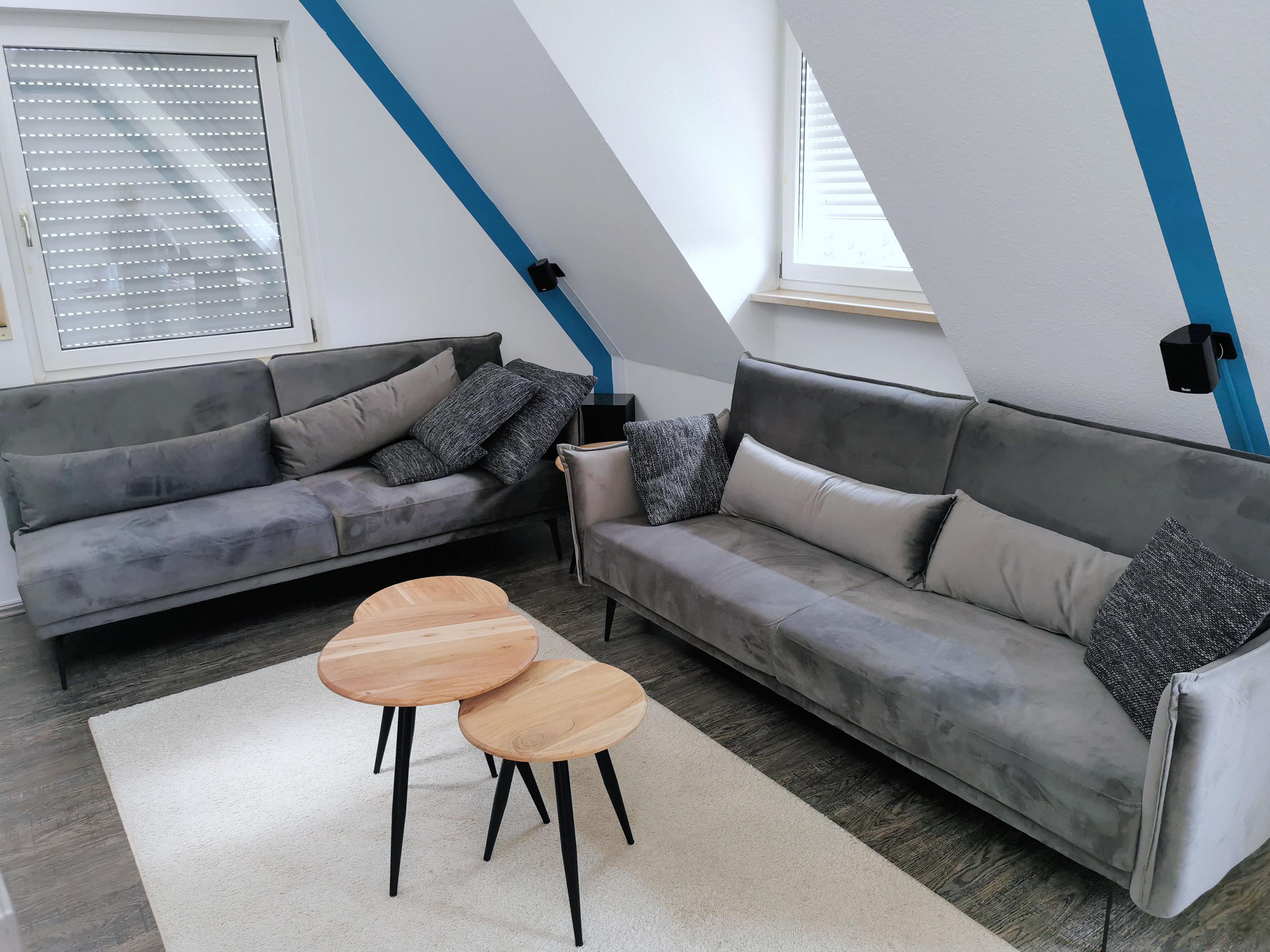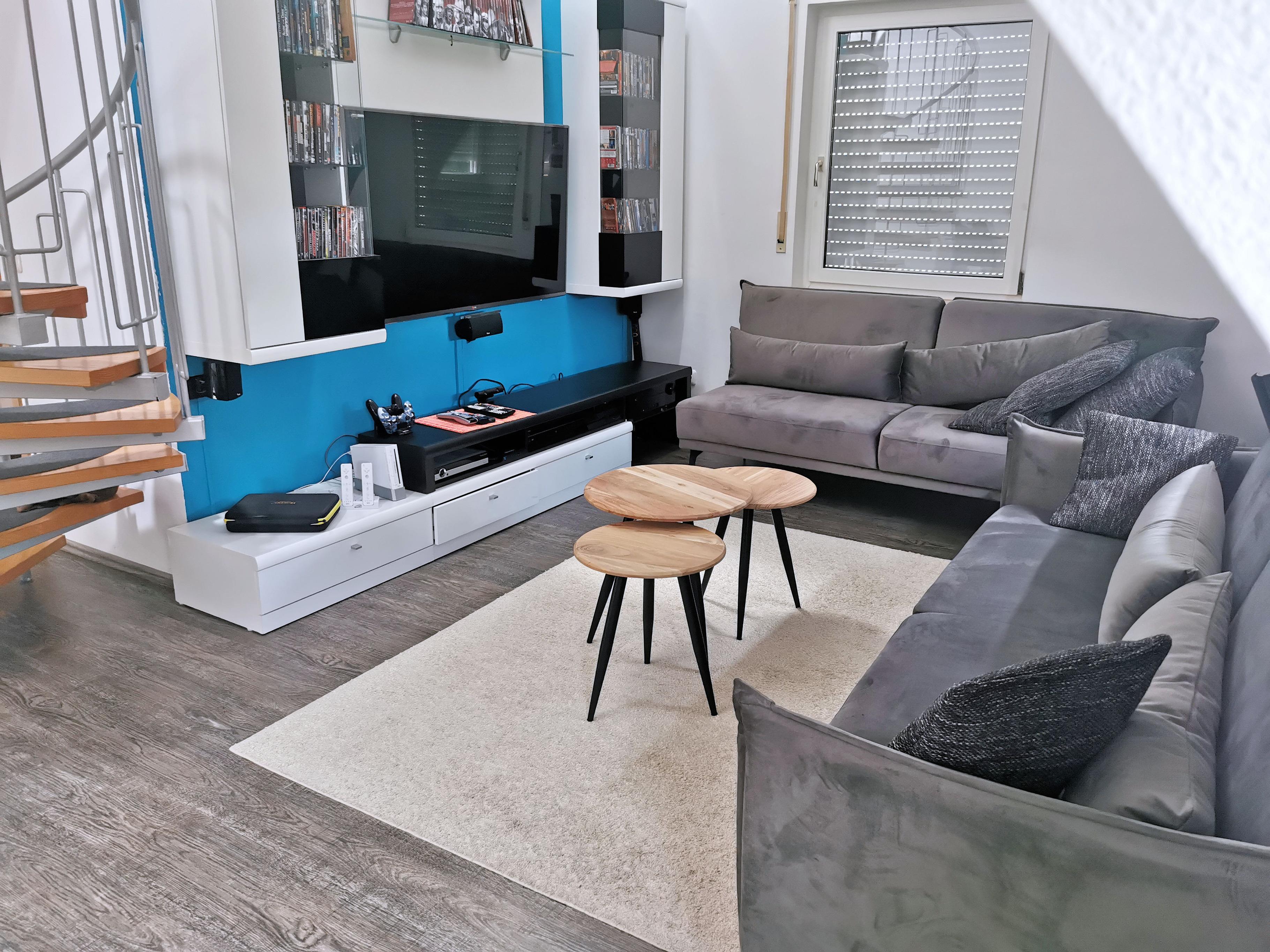 – Heller Wohnraum mit 3D-Fernseher, Nintendo Wii, Playstation 4 mit VR-Brille, Dolby-Surround-Anlage und offener Galerie