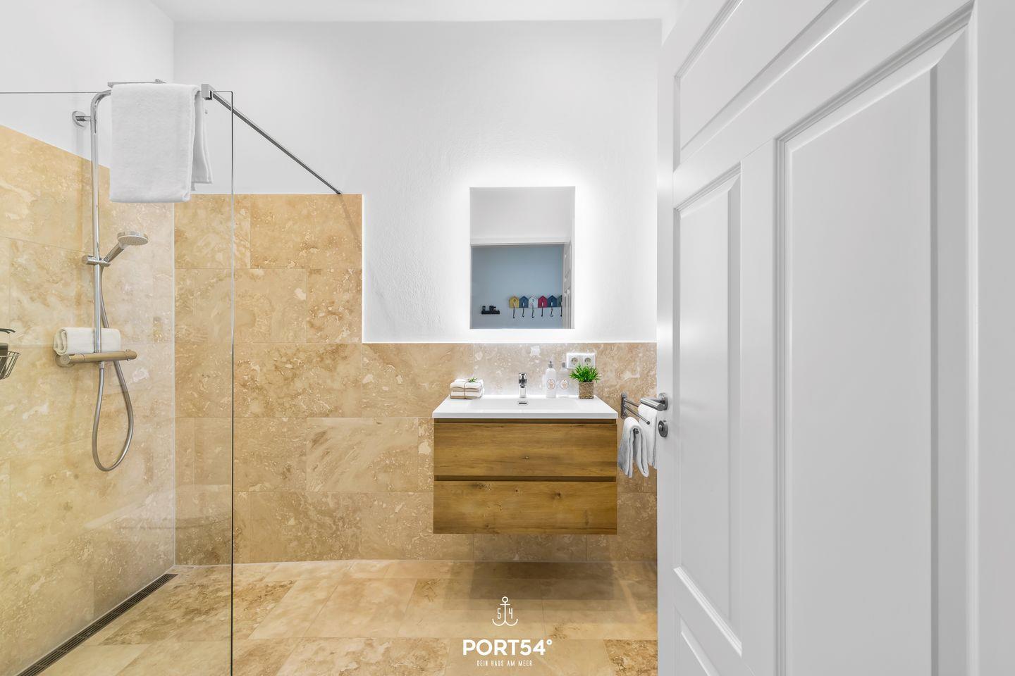 Die beiden vollausgestatteten Badezimmer dieser exklusiven Residenz bieten pure Entspannung und Komfort, mit ebenerdigen Duschen für zusätzliche Bequemlichkeit.