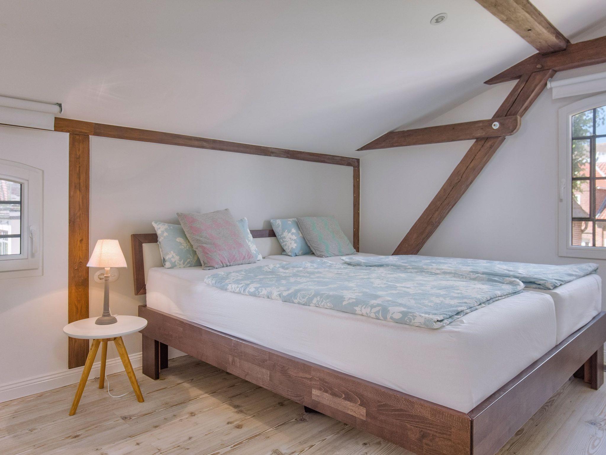 Vier Schlafzimmer mit verschiedenen Bettvariationen stehen zur Verfügung. Das 1.Schlafzimmer mit Doppelbett (180x200), das 2.Schlafzimmer ebenfalls mit Doppelbett (180x200), das 3.Schlafzimmer mit zwei Einzelbetten (90x200) als Doppelbett gestellt, und das 4.Schlafzimmer für Kinder mit einem Einzelbett (80x200), welches auf 160x200 ausgezogen werden kann. Kleiderschränke und Kommoden bieten dabei ausreichenden Stauraum. Allergiker geeignete Bettwäsche, Handtuchsets, Babyreisebett (ohne Bettzeug) und Hochstuhl können bei Bedarf gegen Gebühr geliehen werden. Für Verdunklung und nächtliche Ruhe sorgen hier blickdichte Rollos.