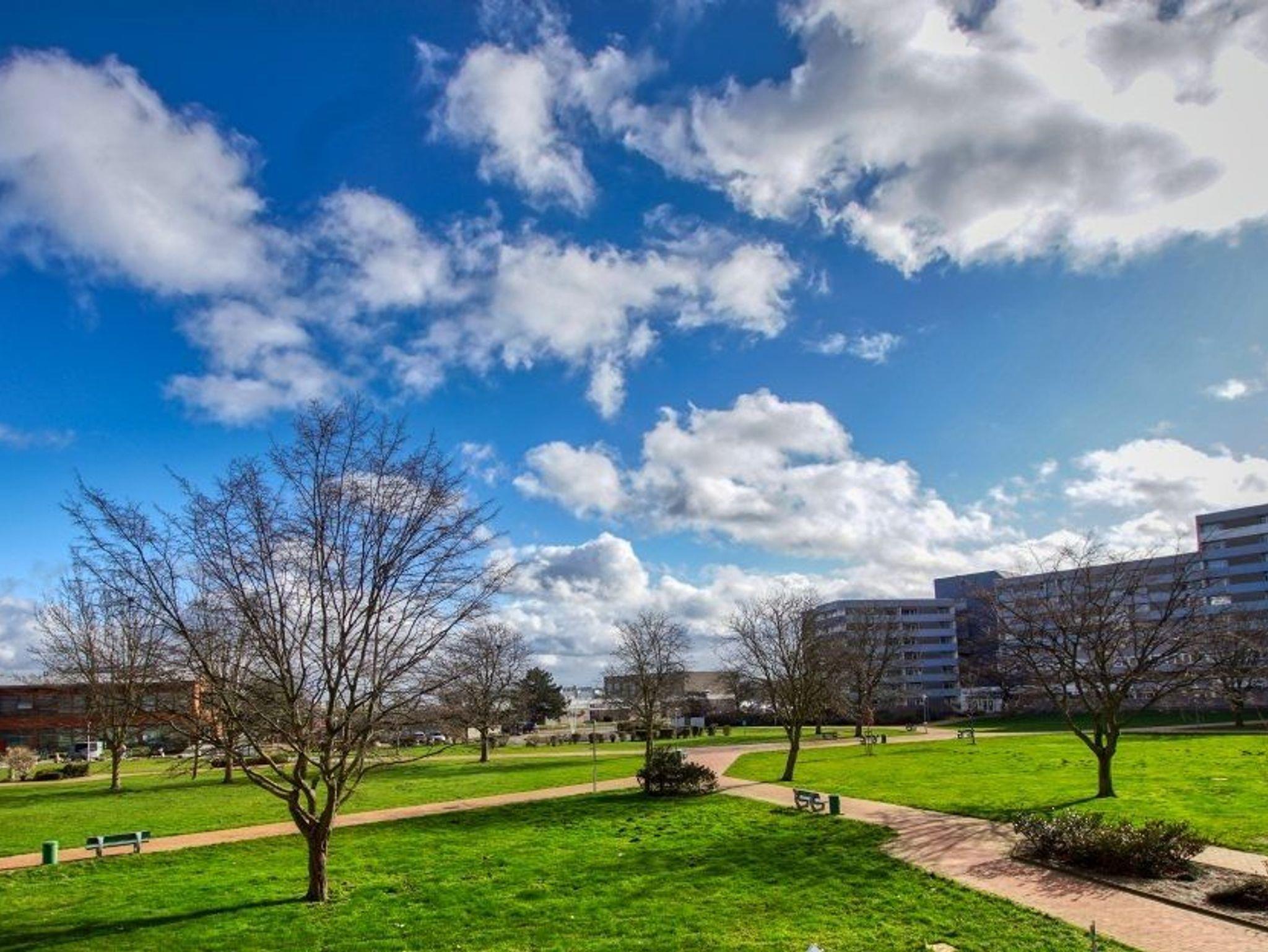 Moderne Ferienwohnung im Ferienpark Heiligenhafen mit Balkon und Blick auf den Innenhof.